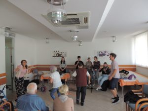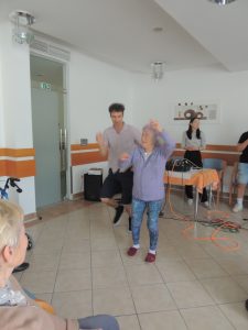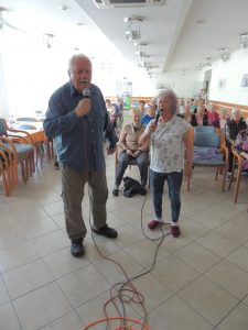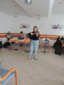 Predzadnja točka je bila igriva in energična – vsi skupaj so zapeli in tudi zaplesali ob pesmi Račke. Tudi stanovalci, ki so ostali sede, so veselo migali in peli. Za zaključek je Tajda ponovno poprijela za violino in s klasično skladbo zaokrožila to prelepo glasbeno popoldne.