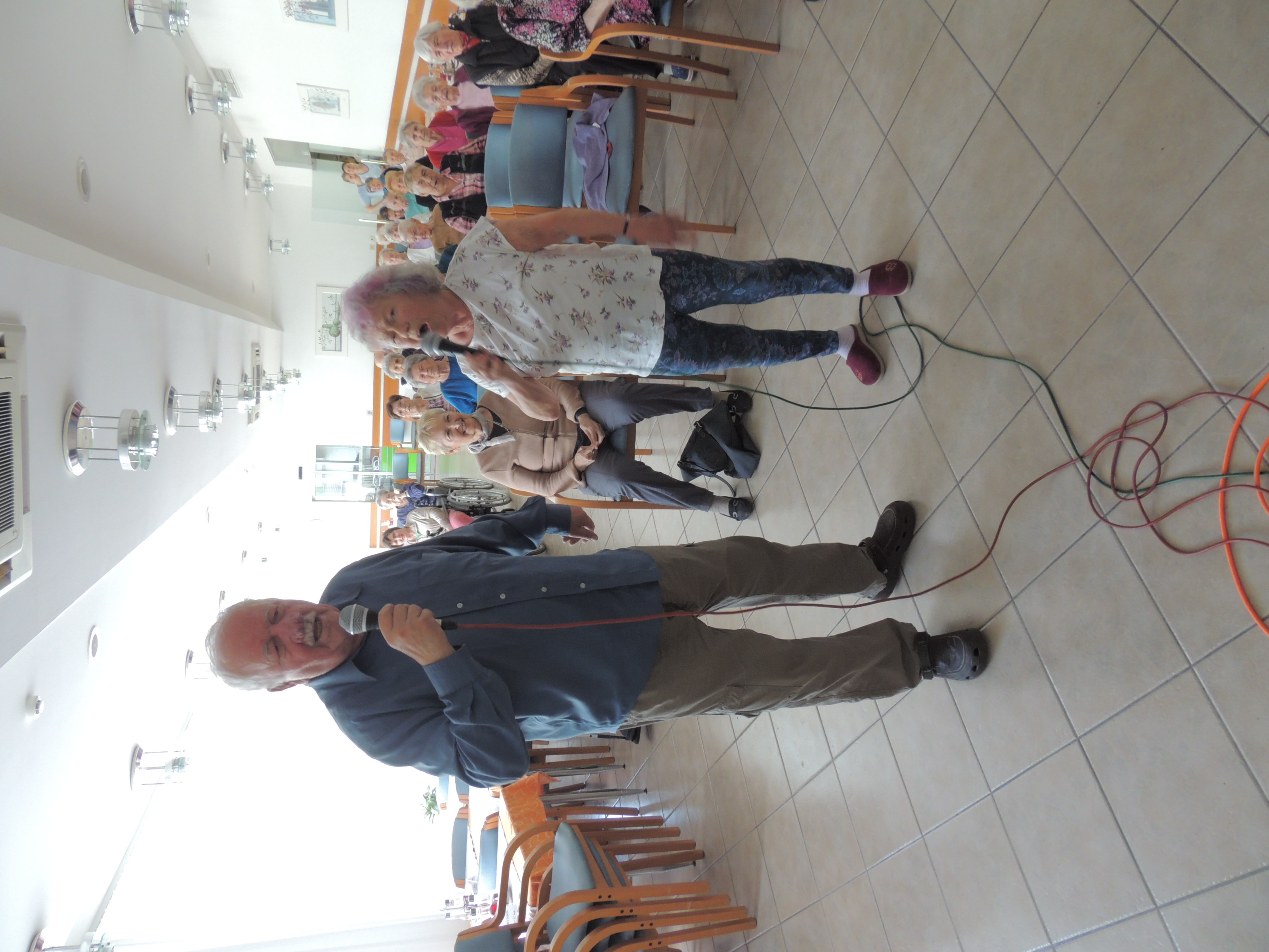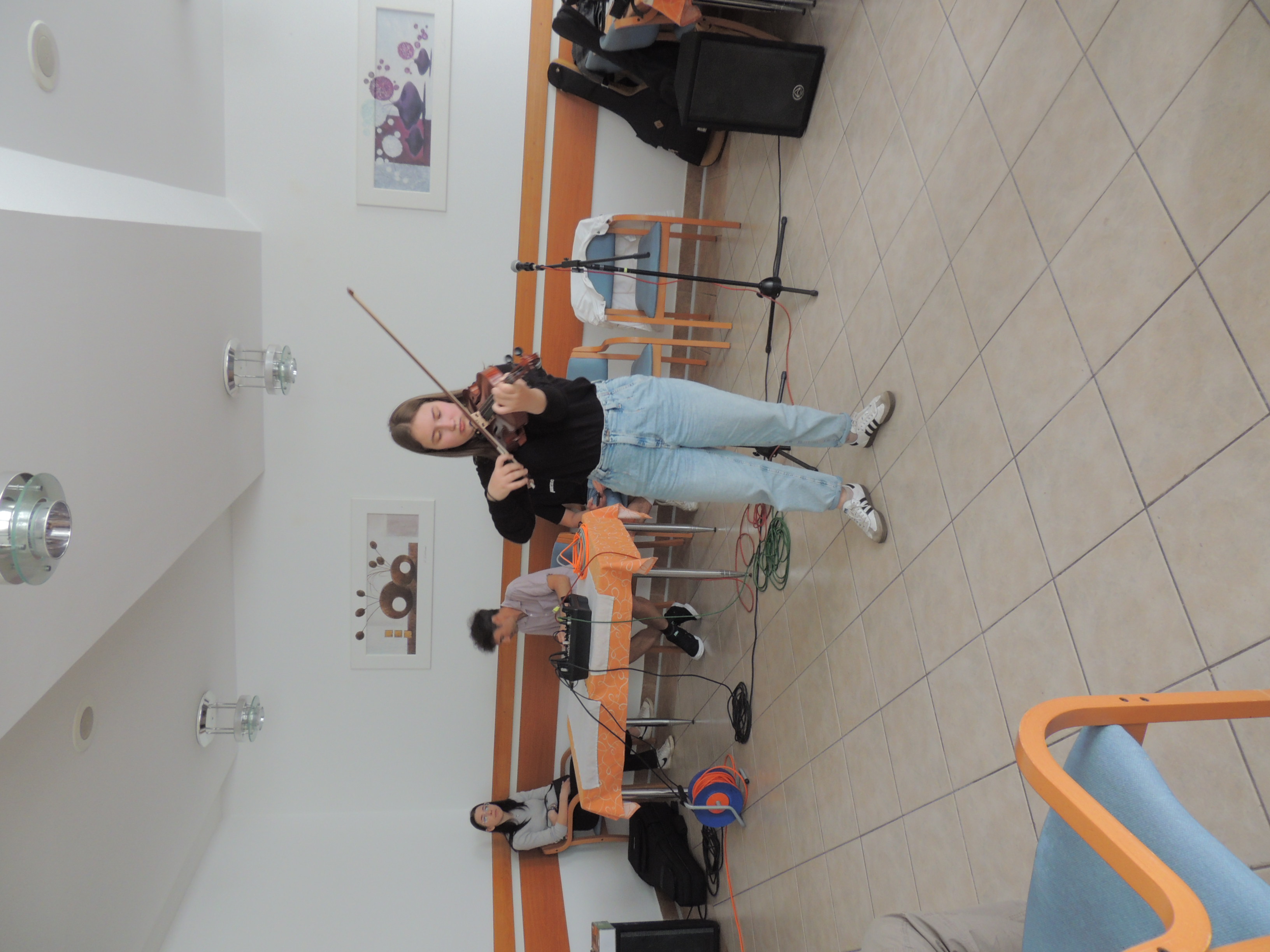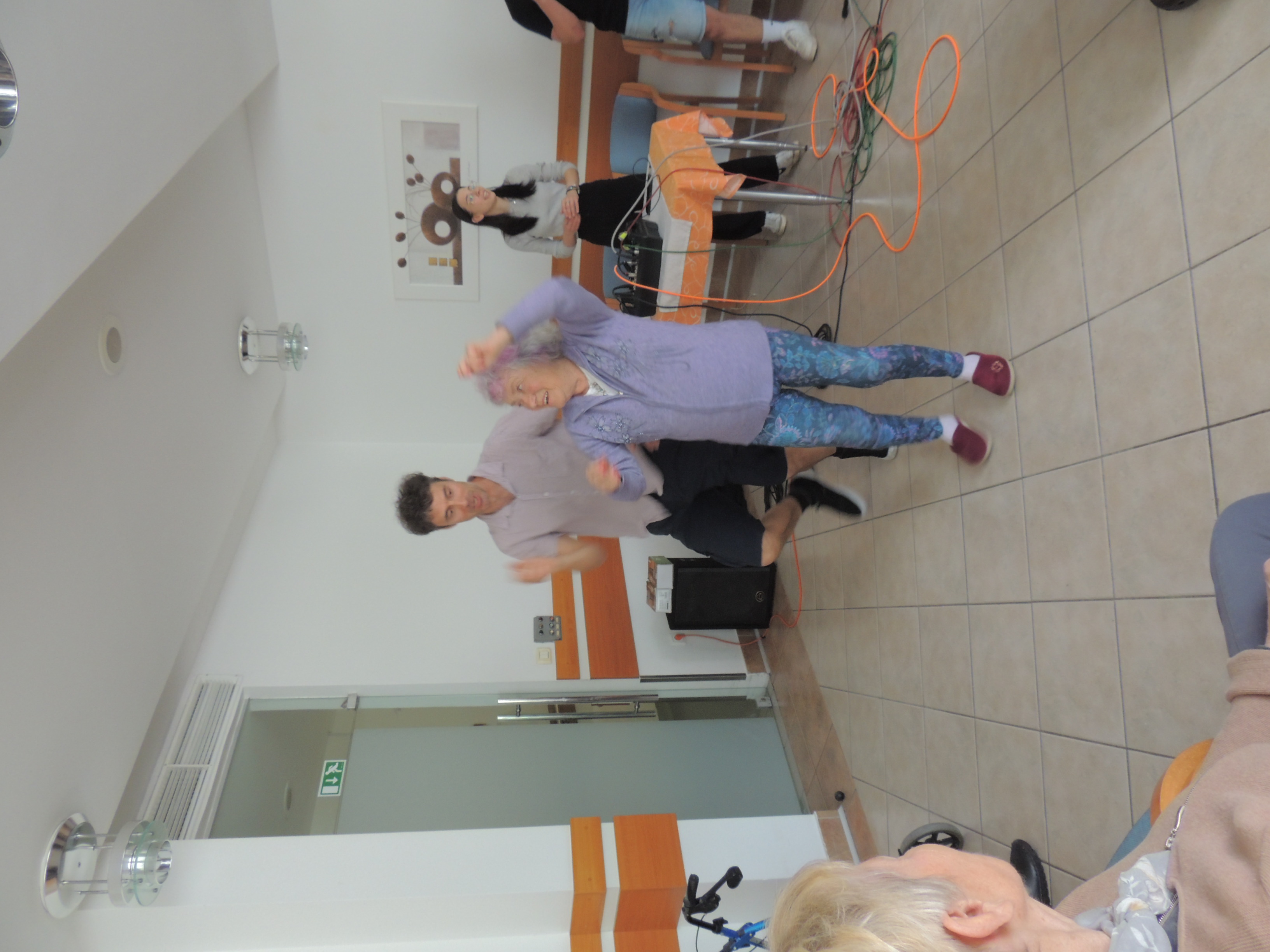 Predzadnja točka je bila igriva in energična – vsi skupaj so zapeli in tudi zaplesali ob pesmi Račke. Tudi stanovalci, ki so ostali sede, so veselo migali in peli. Za zaključek je Tajda ponovno poprijela za violino in s klasično skladbo zaokrožila to prelepo glasbeno popoldne.