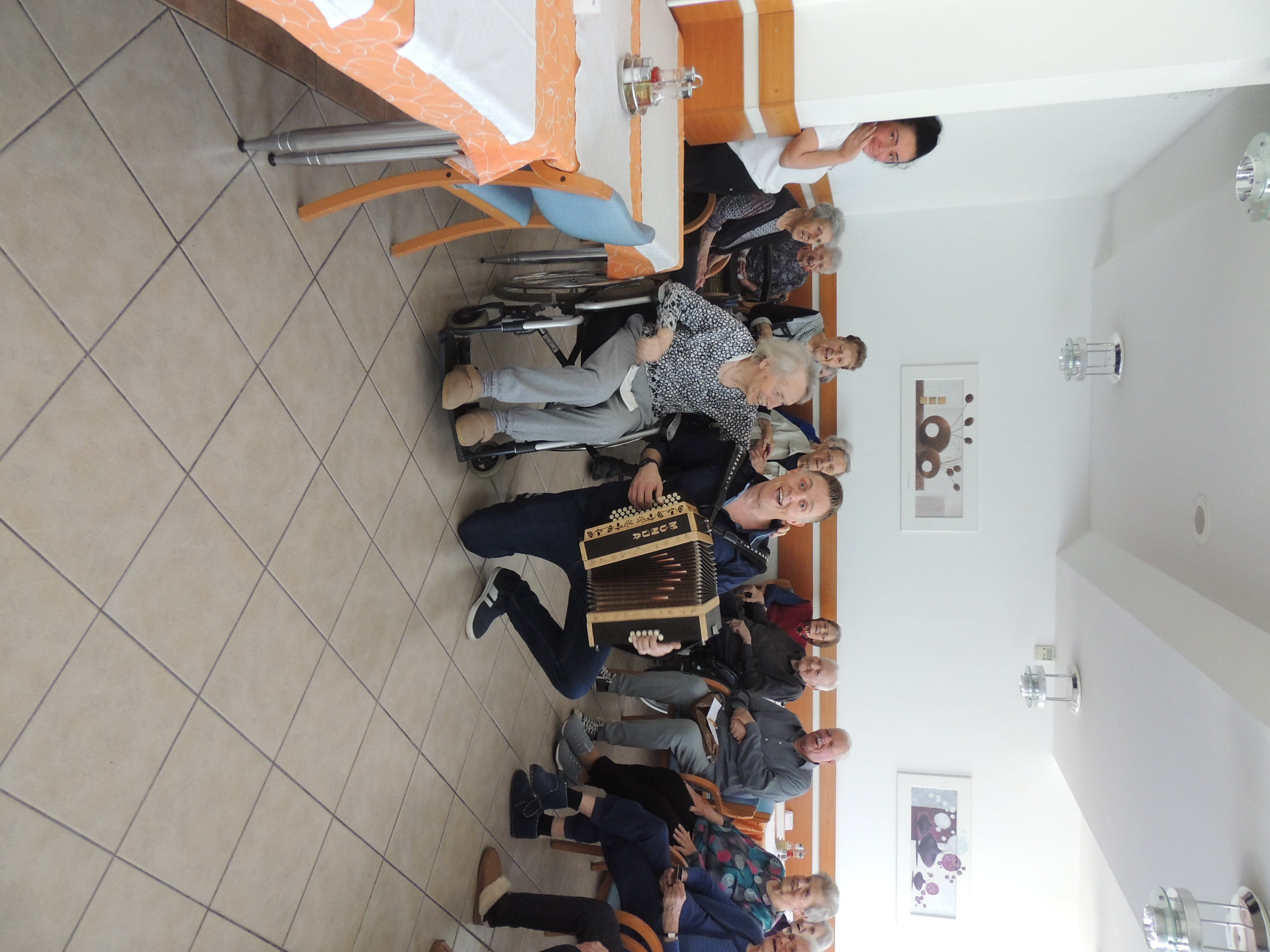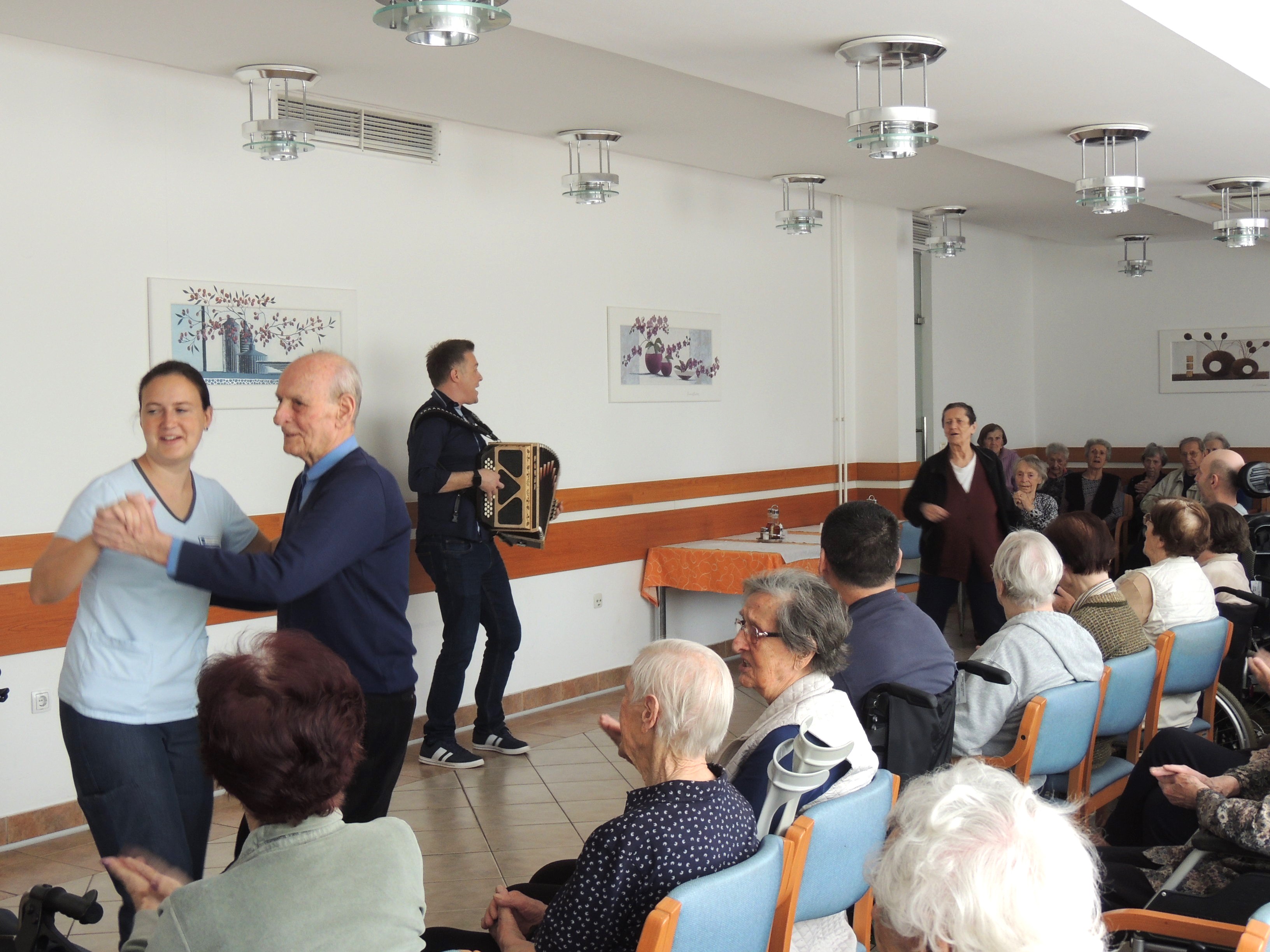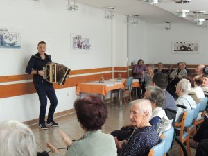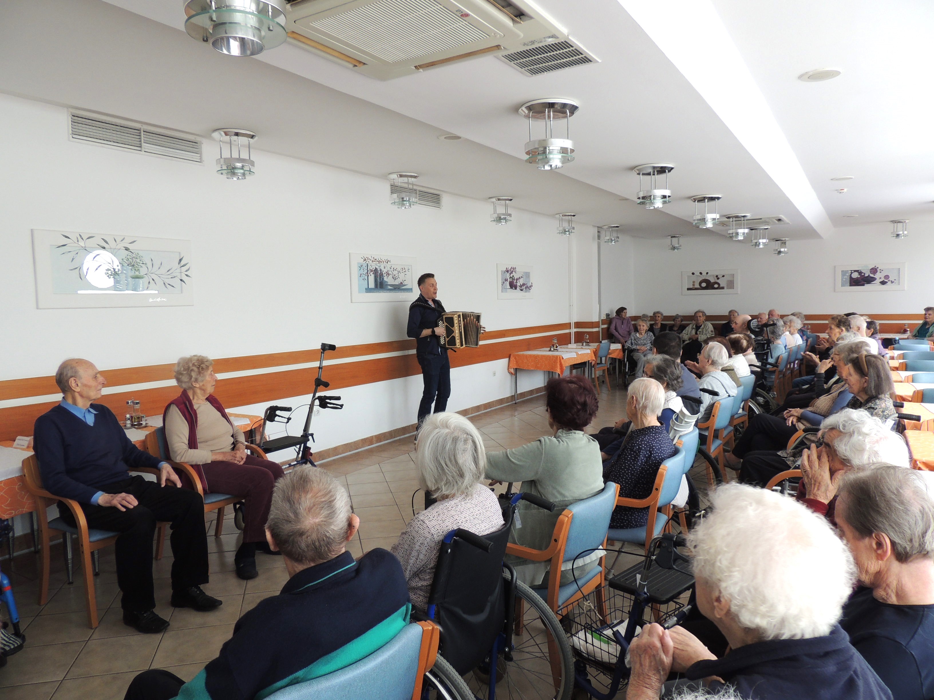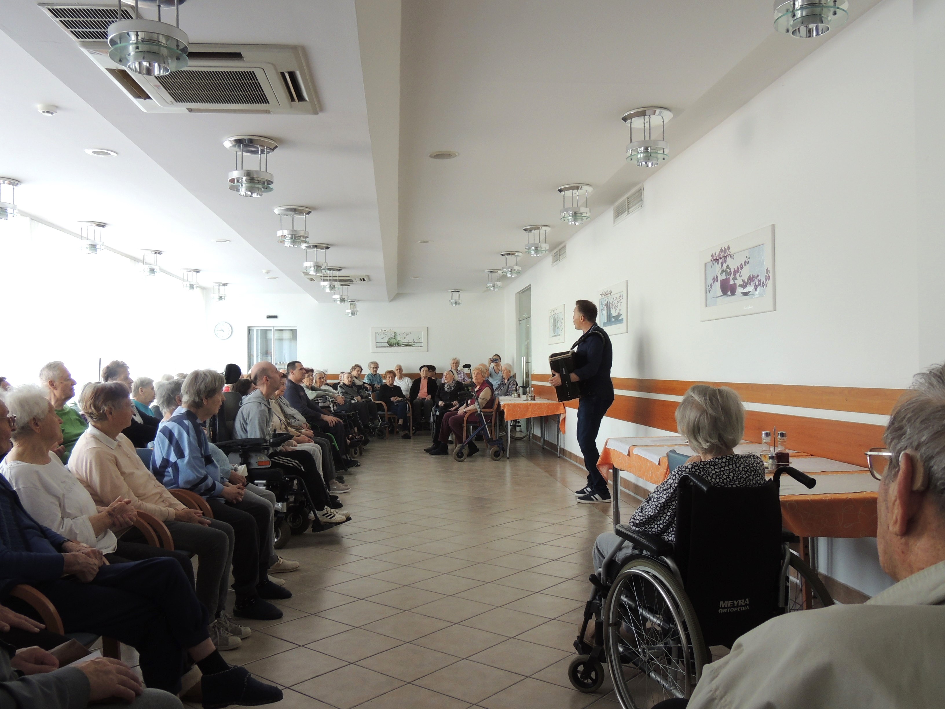 V sredo, 16. 4. 2025, je v veliki jedilnici zazvenela harmonika Nejca Kastelica in pričarala prijetno glasbeno dopoldne. Že ob prvih tonih so se stanovalci pozibavali na stolih in z nasmehi sprejeli melodije, ki so jim bile blizu.