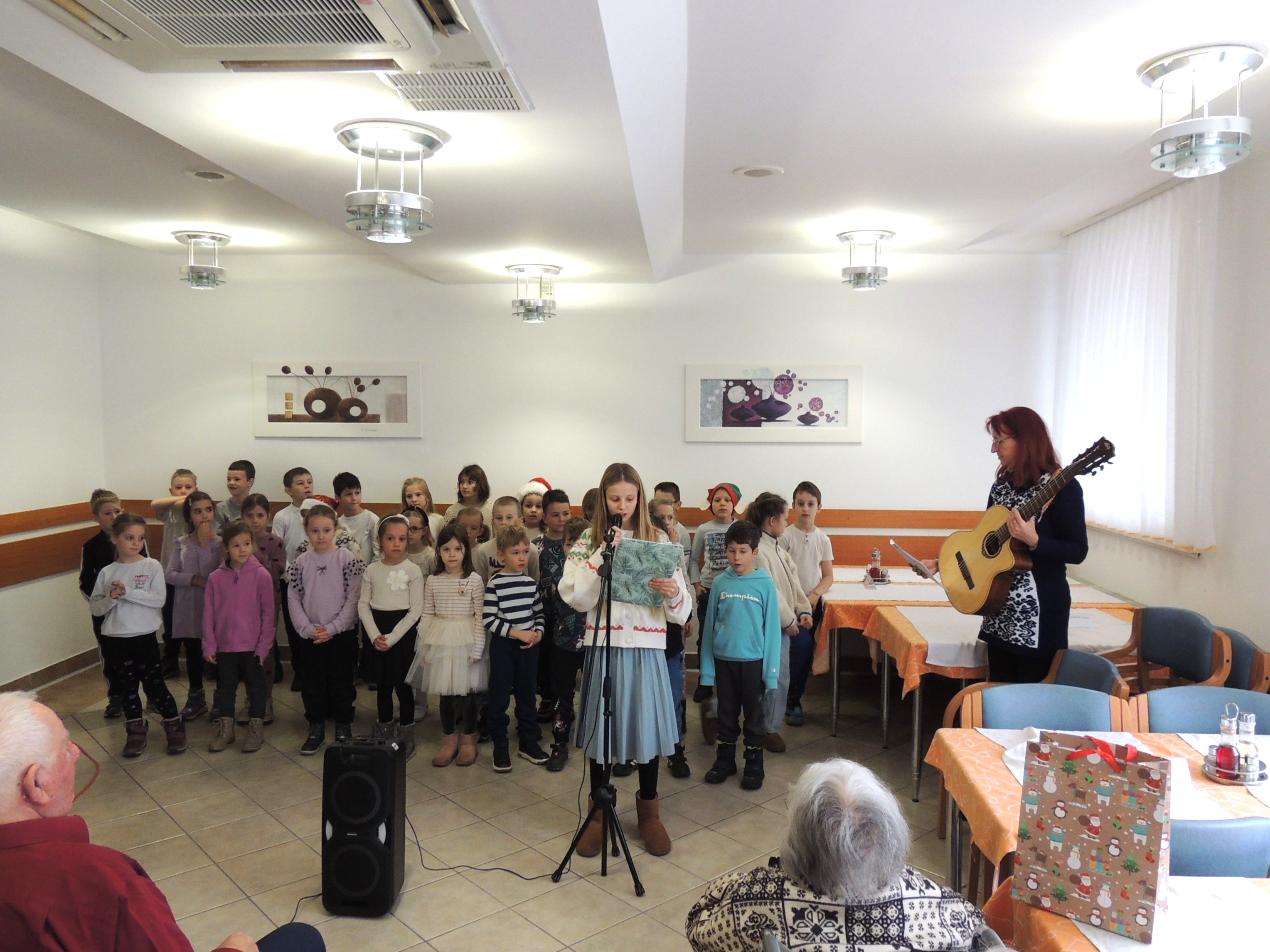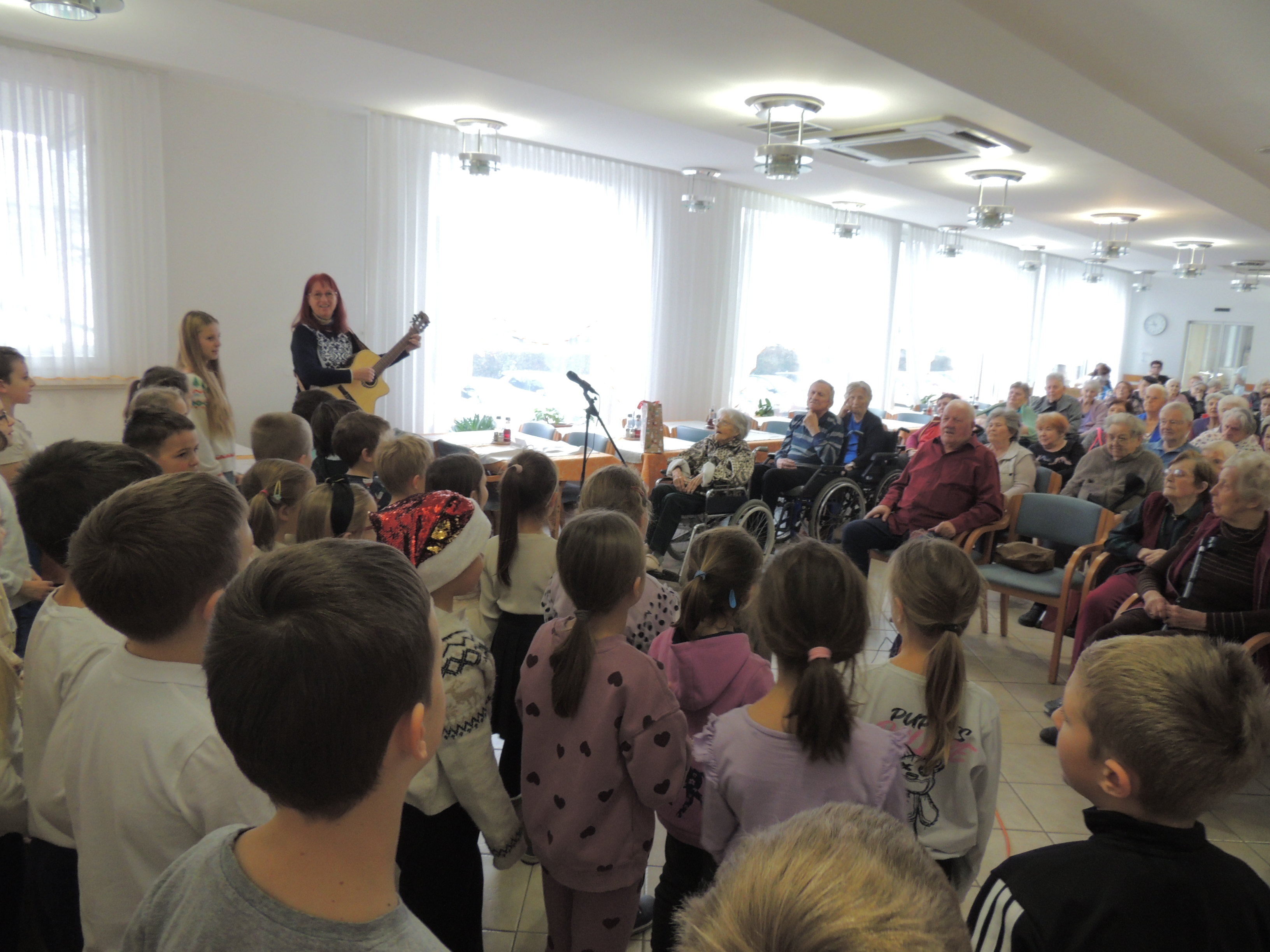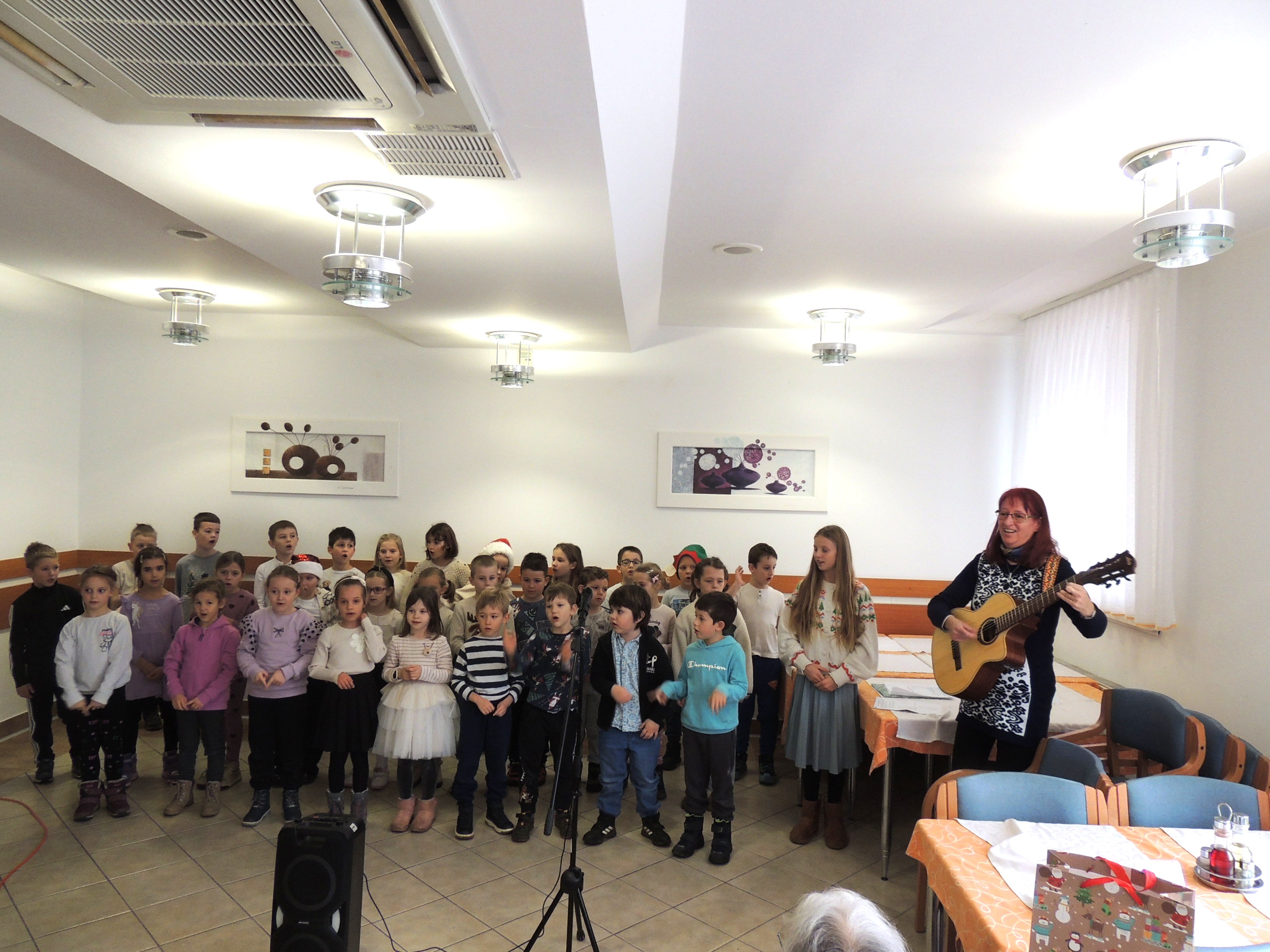 V ponedeljek, 15. decembra 2025, so nas s svojim obiskom razveselili učenci 1. in 2. razreda Osnovne šole Danile Kumar, vodstvom učiteljice gospe Jožice Rupar med nas prinesli otroško razigranost. Njihov nastop je bil preplet pesmi, recitacij in iskrenega otroškega veselja. Učenci so nam pokazali, da radi pojejo pesmi ob spremljavi kitare, kar se je čutilo v vsaki zapeti pesmi.