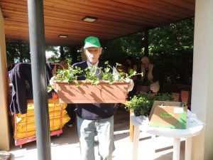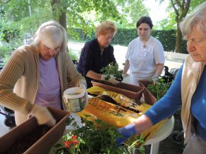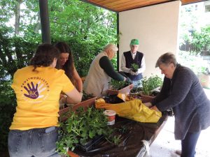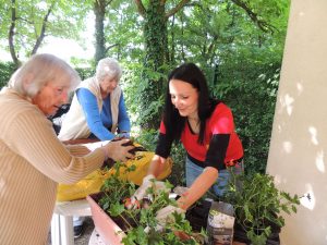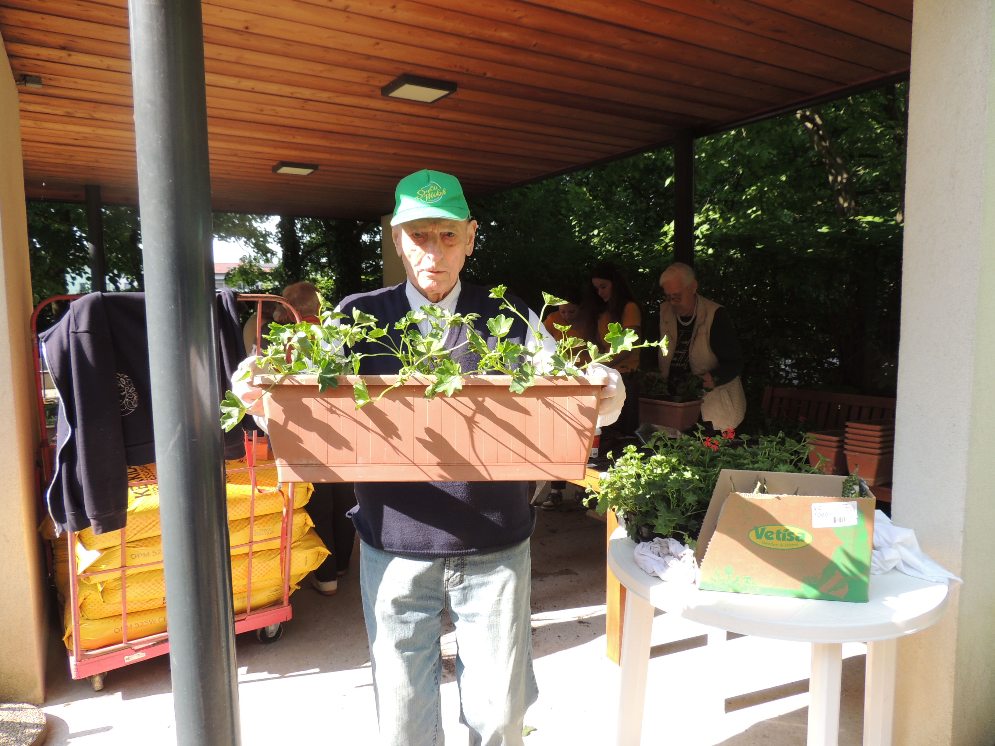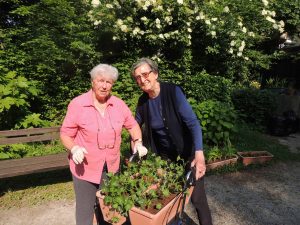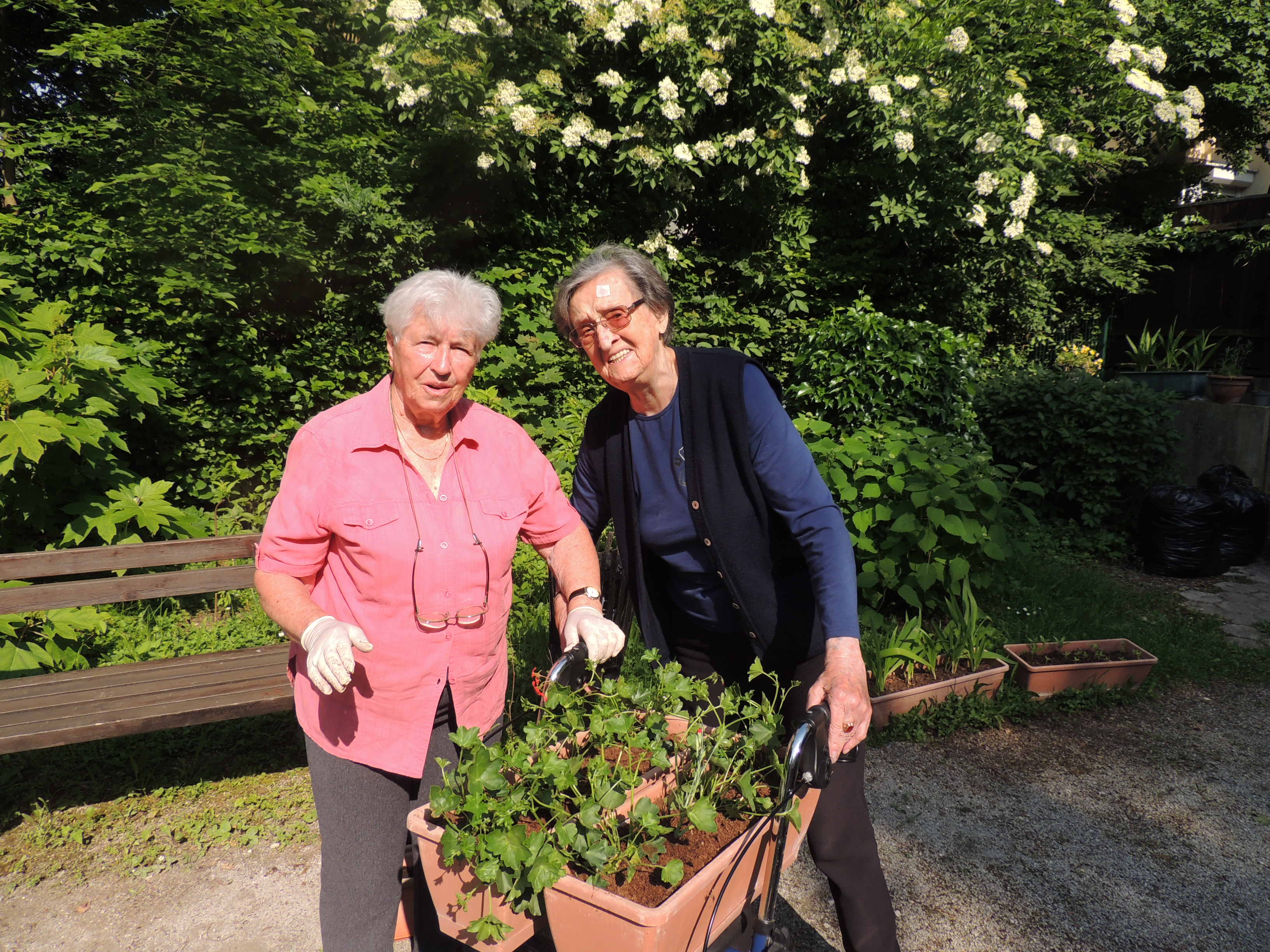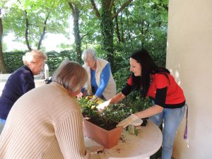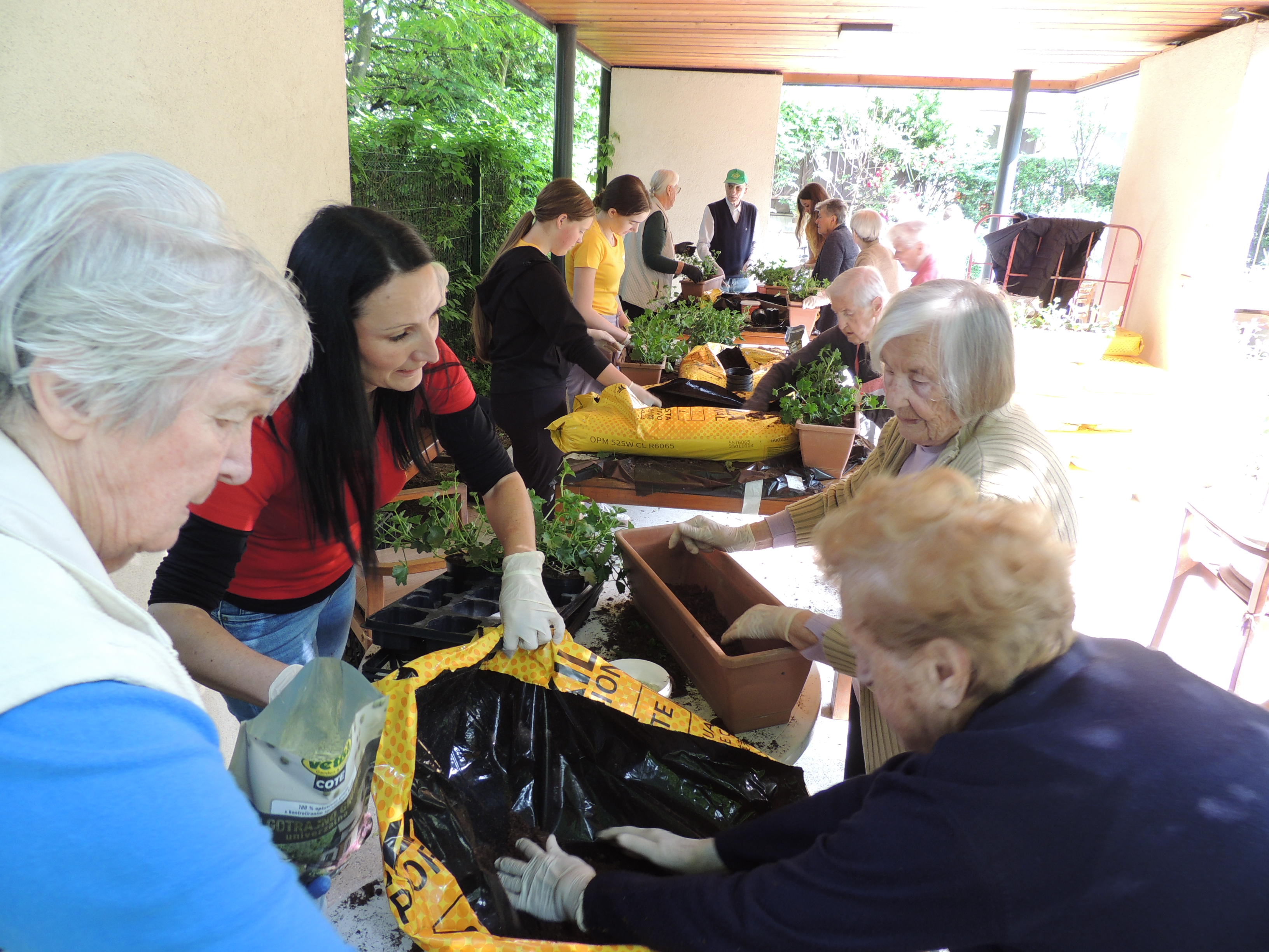 Stanovalke so ob podpori prostovoljk z veseljem presajale pelargonije – ene najbolj priljubljenih in dolgoletnih okenskih ter balkonskih rastlin. Pelargonije so skromne rastline, ki najlepše uspevajo na sončnih legah, dobro pa prenašajo tudi polsenco in senco, kjer sicer nekoliko manj cvetijo. Pomembno je redno odstranjevanje odcvetelih cvetov. Poleti jih zalivamo redno, najbolje v jutranjih urah, pri čemer pazimo, da zalijemo le zemljo.