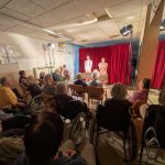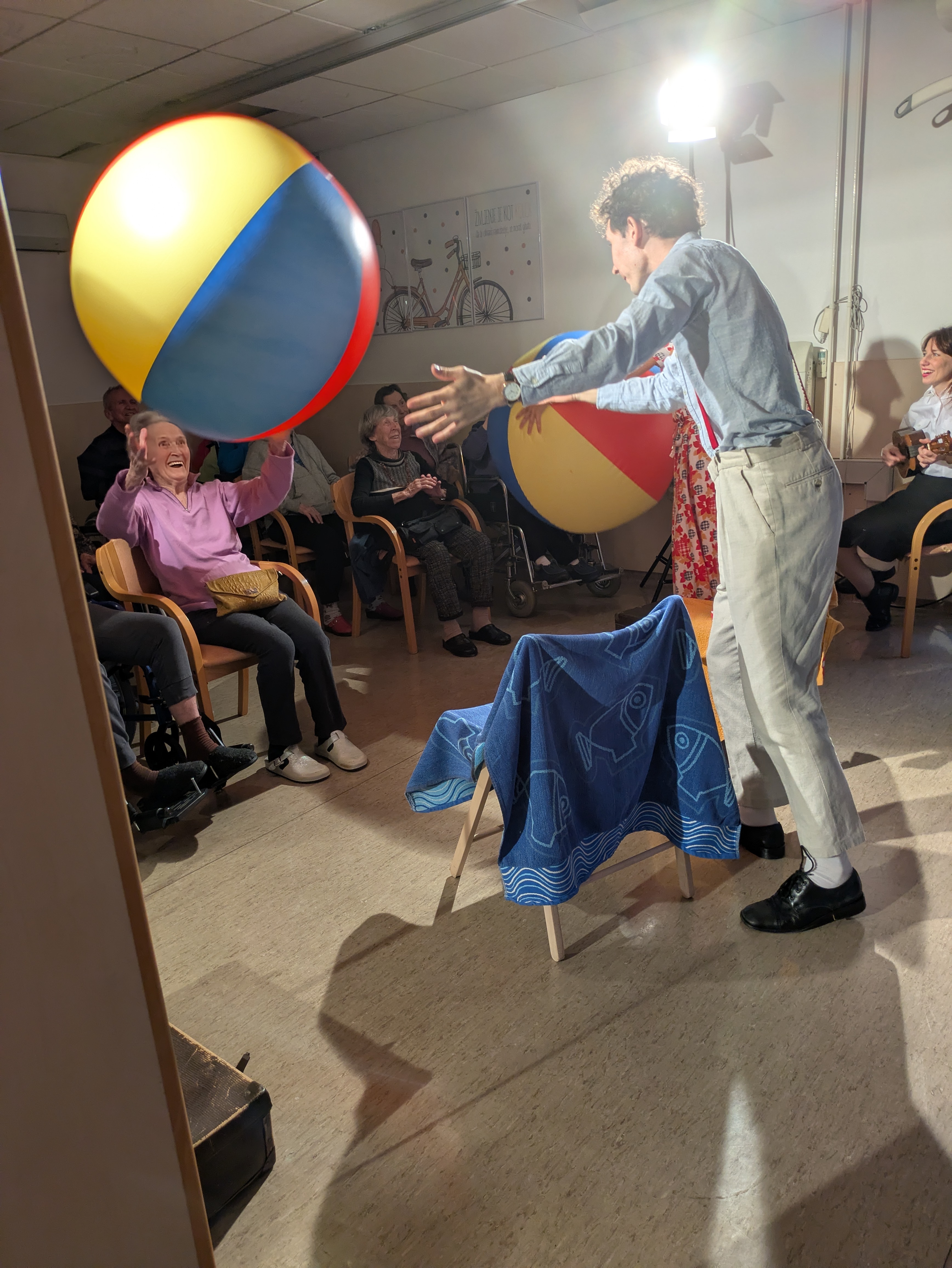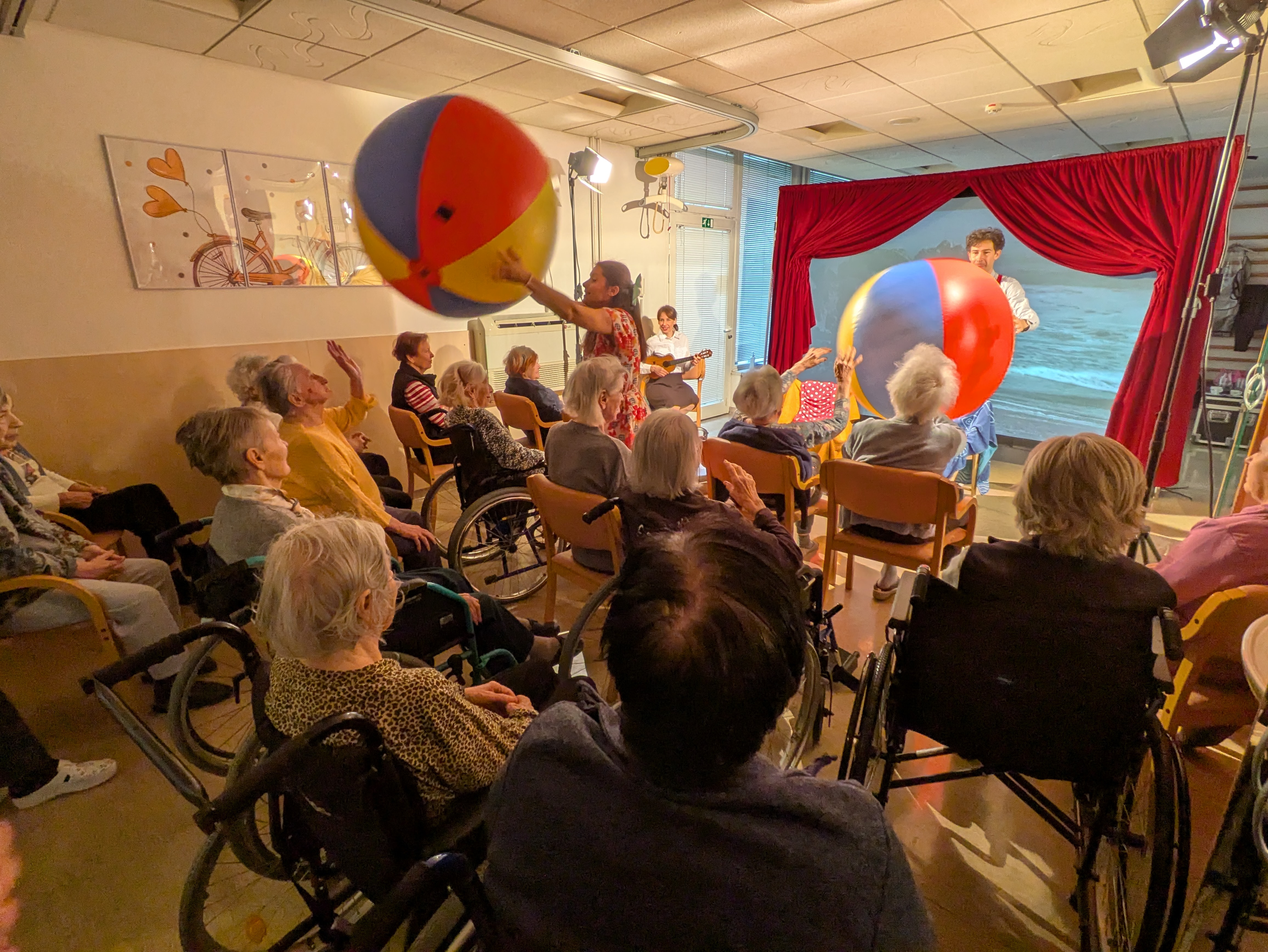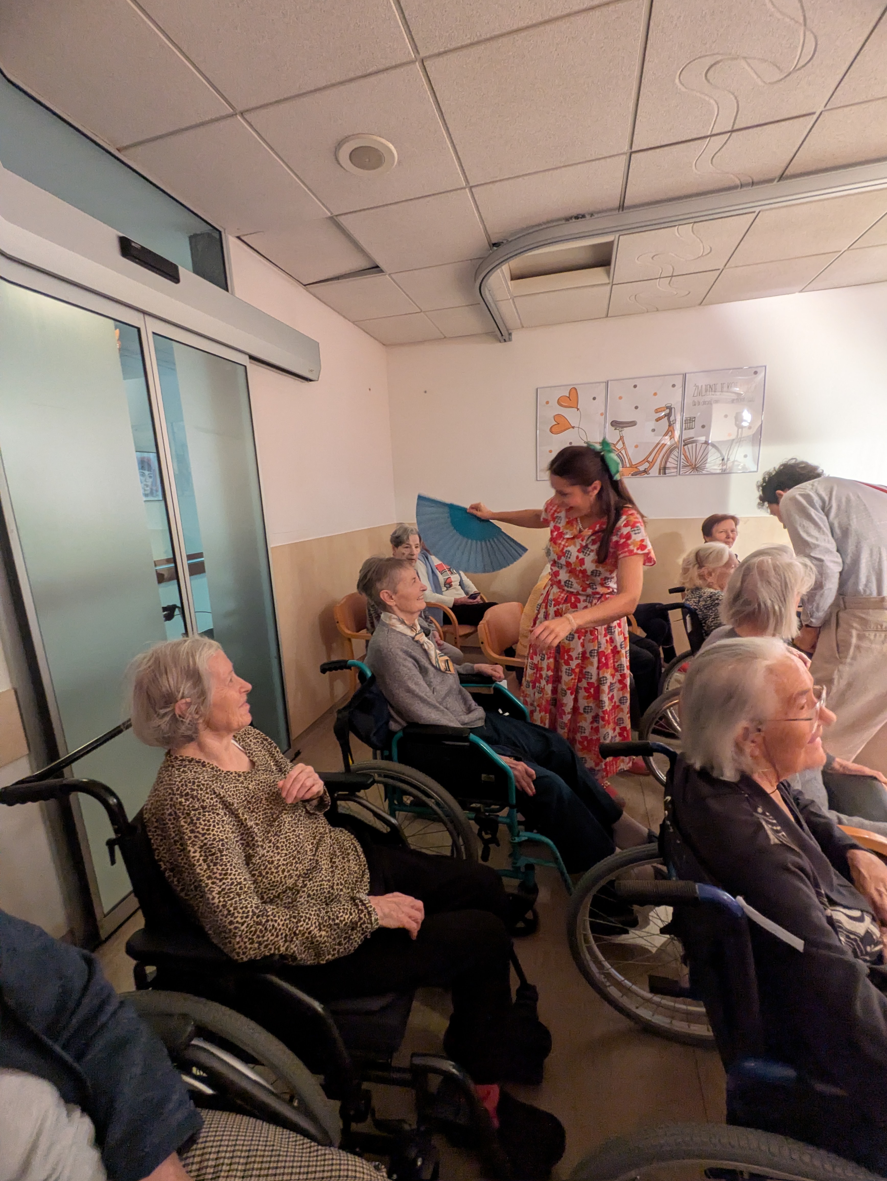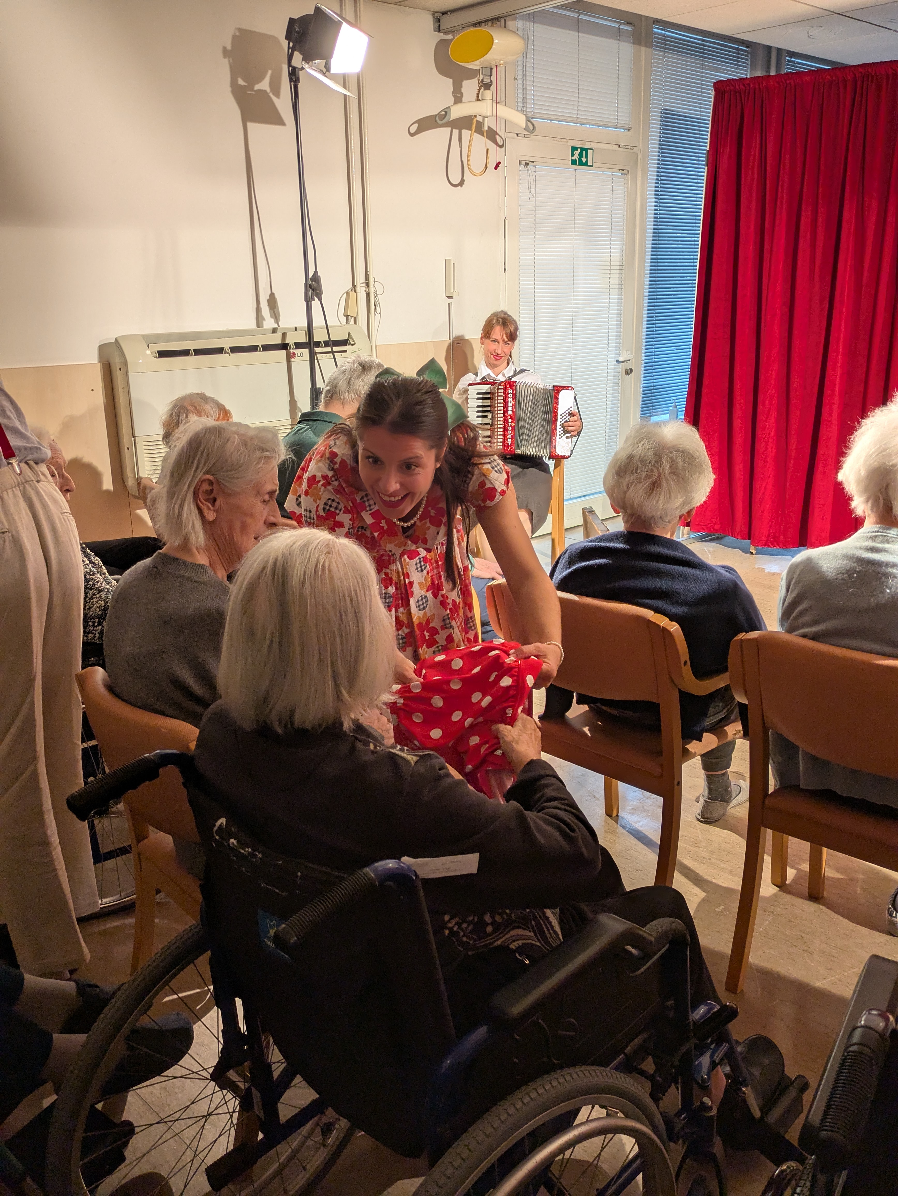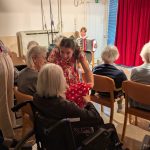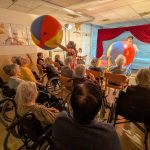 V ponedeljek, 26. 1. 2026 nas je v Domu obiskala ekipa Rdečih noskov, ki je za stanovalce z demenco pripravila in izvedla gledališko predstavo Gremo na morje. V prostoru fizioterapije so pripravili pravo gledališko sceno, ki nas je popeljala na morje, v topli poletni čas. Predstavo so uprizorili dvakrat, tako da si jo je lahko ogledalo skupaj 32 stanovalcev in je prilagojena osebam z demenco, zato je bila krajša. Besedilo v predstavi je bilo enostavno, več poudarka je bilo na tem, da stanovalci poslušajo različne zvoke (glasbila, zvoki narave, lokomotive…) in opazujejo naravo skozi okno lokomotive, s katero sta se peljala nastopajoča na morje. Nastopajoča sta šla med gledalce in jim dala povonjati olje borovcev, potipati brisačo in kopalke, s pahljačo so lahko začutili veter in si podajali velikanski žogi. Na ta način so bili stanovalci ves čas del predstave in jo še bolj intenzivno doživeli.