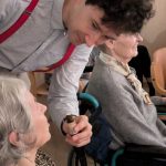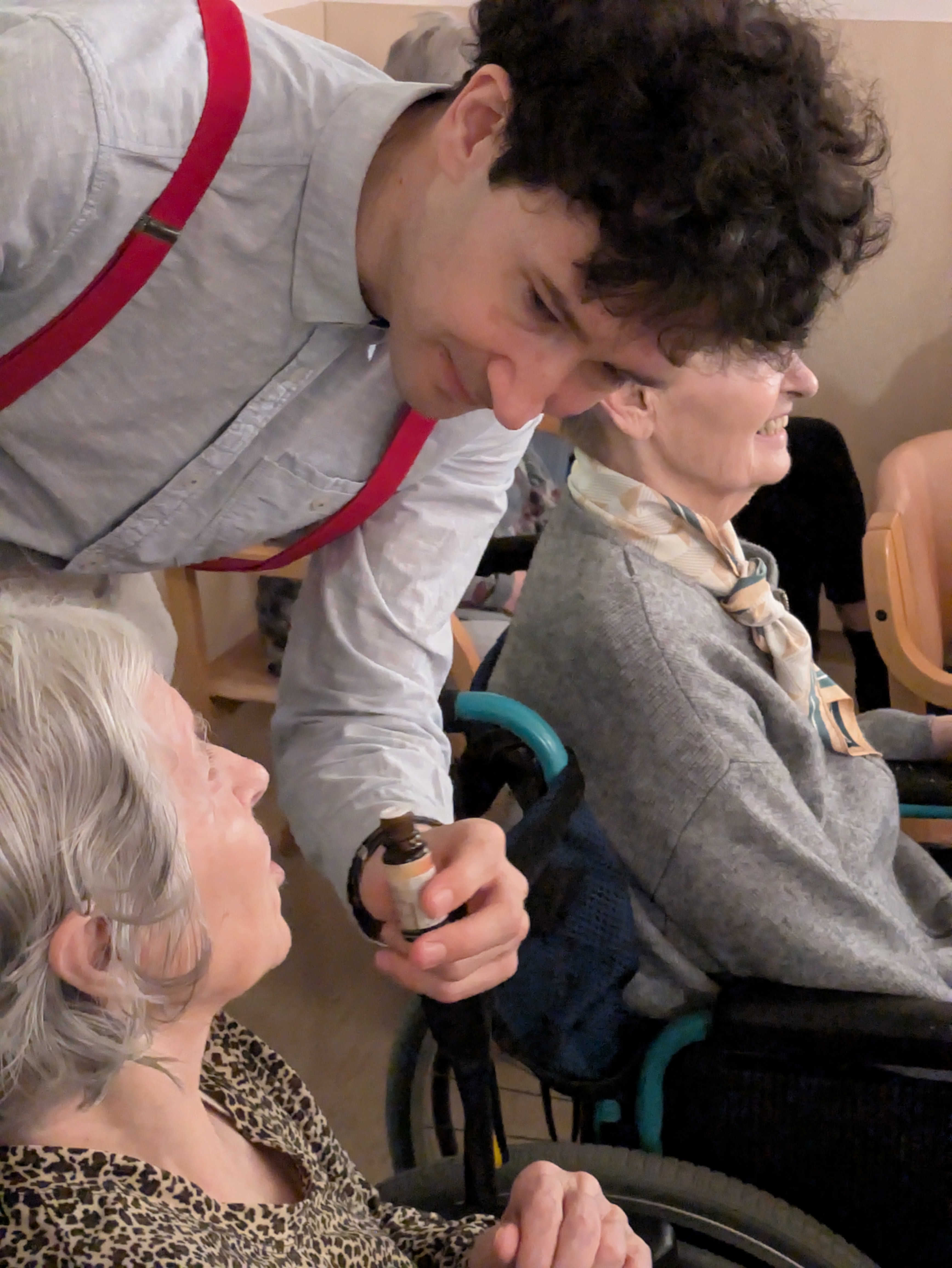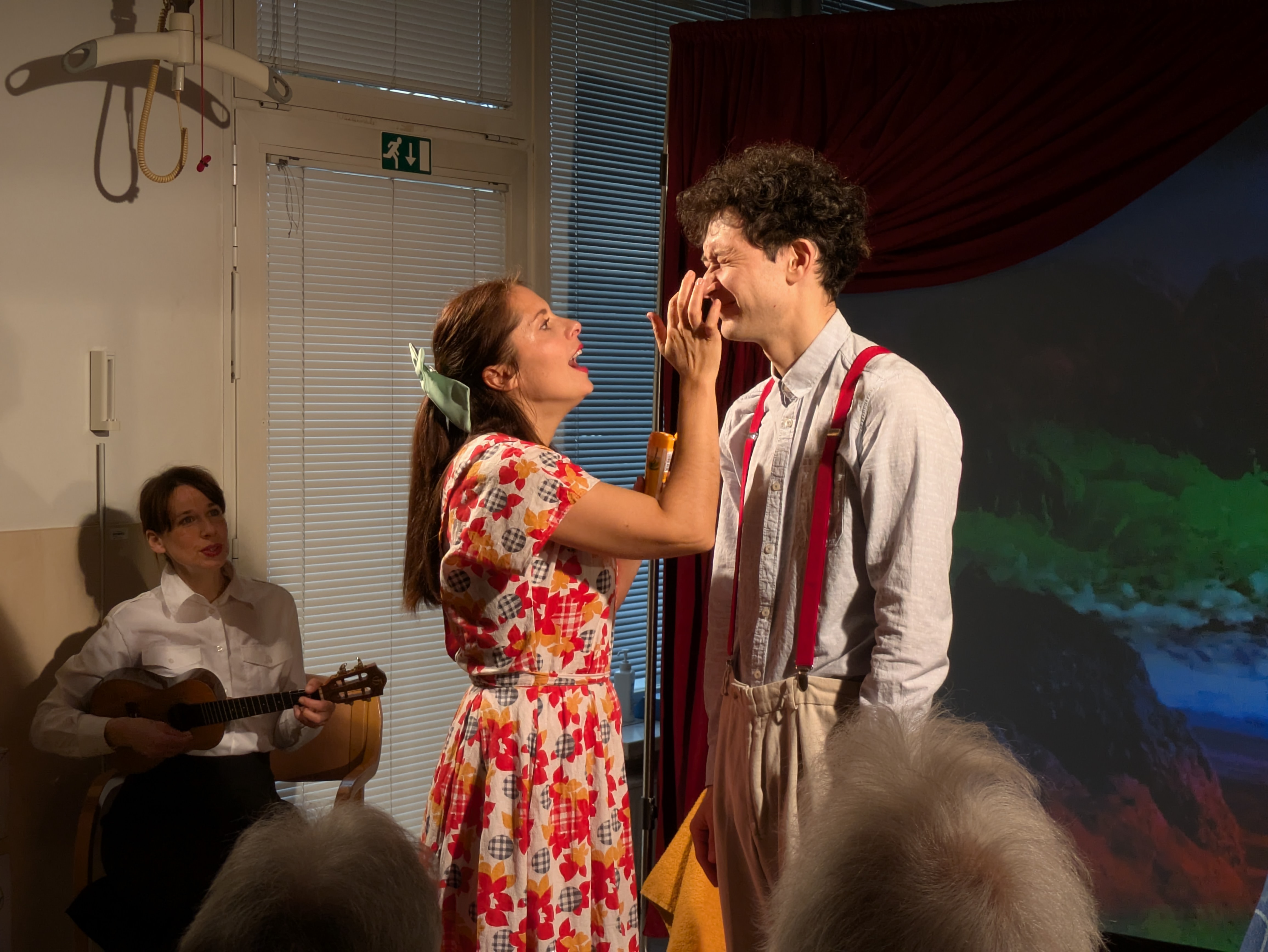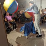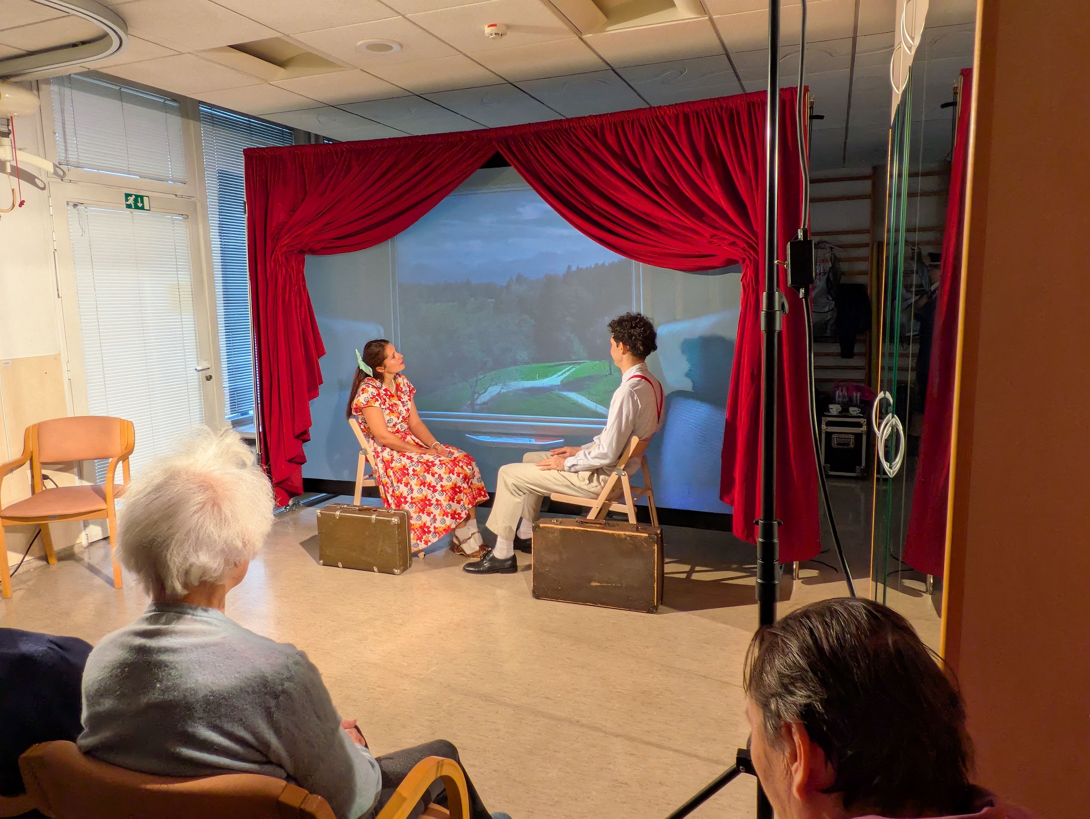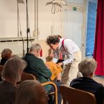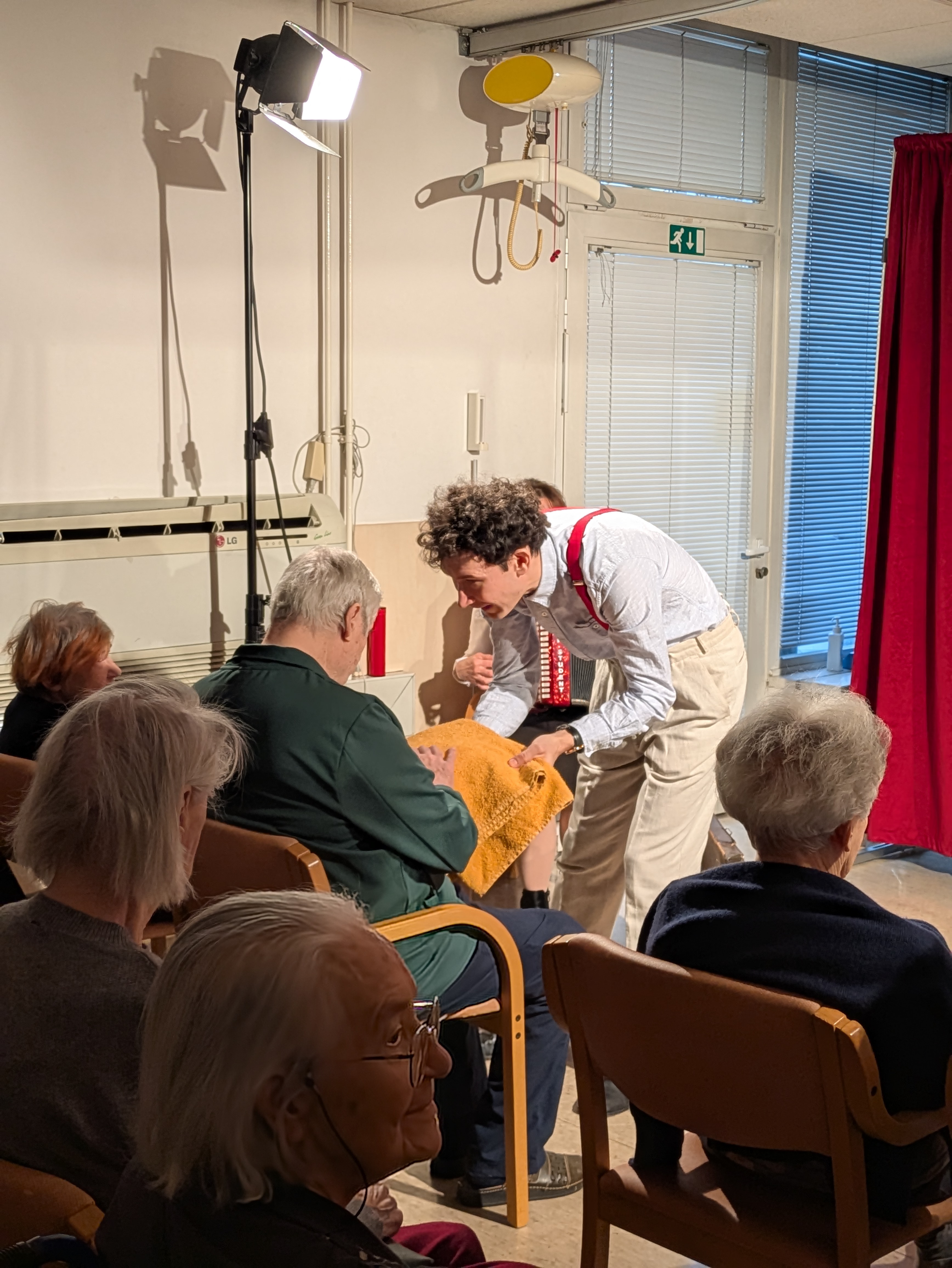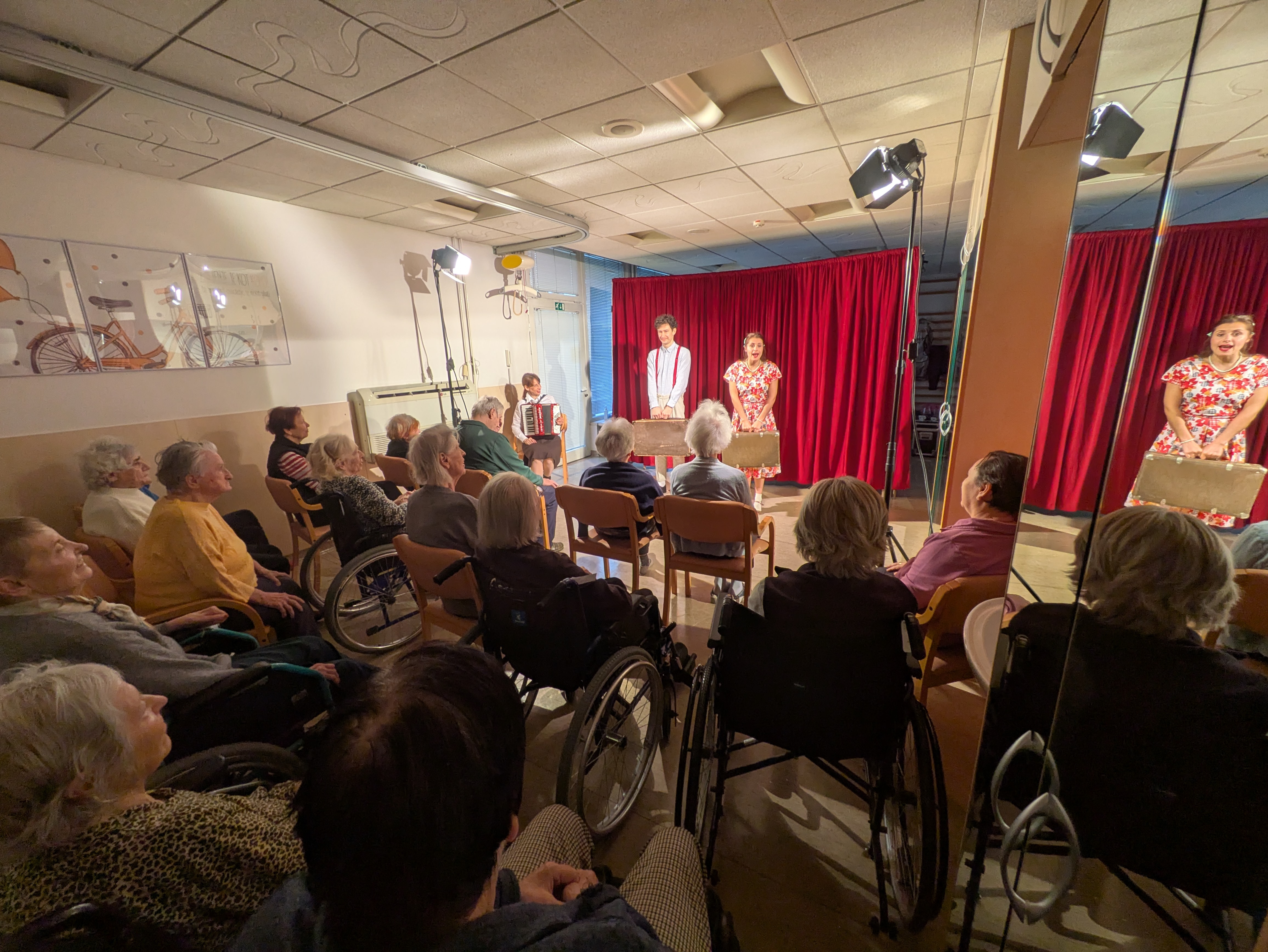 V ponedeljek, 26. 1. 2026 nas je v Domu obiskala ekipa Rdečih noskov, ki je za stanovalce z demenco pripravila in izvedla gledališko predstavo Gremo na morje. V prostoru fizioterapije so pripravili pravo gledališko sceno, ki nas je popeljala na morje, v topli poletni čas. Predstavo so uprizorili dvakrat, tako da si jo je lahko ogledalo skupaj 32 stanovalcev in je prilagojena osebam z demenco, zato je bila krajša. Besedilo v predstavi je bilo enostavno, več poudarka je bilo na tem, da stanovalci poslušajo različne zvoke (glasbila, zvoki narave, lokomotive…) in opazujejo naravo skozi okno lokomotive, s katero sta se peljala nastopajoča na morje. Nastopajoča sta šla med gledalce in jim dala povonjati olje borovcev, potipati brisačo in kopalke, s pahljačo so lahko začutili veter in si podajali velikanski žogi. Na ta način so bili stanovalci ves čas del predstave in jo še bolj intenzivno doživeli.