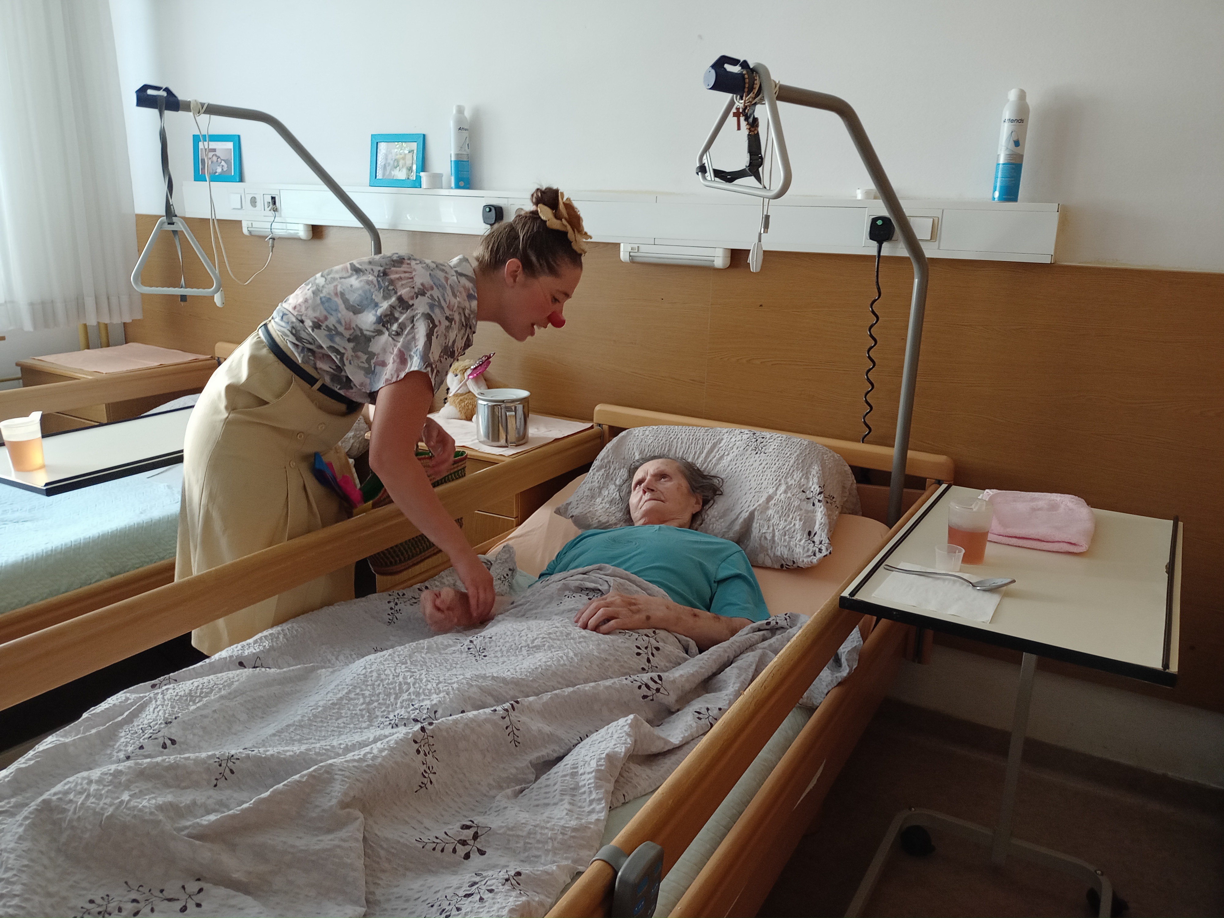 Kot vsak mesec, so nas tudi v juliju obiskali Rdeči noski. Klovnesi Vandra in Erika sta s petjem, plesom in prijazno besedo priklicali nasmeh na obraze stanovalcev, ki sta jih obiskali. Marsikdo izmed njih se jima je pri petju tudi pridružil.