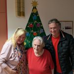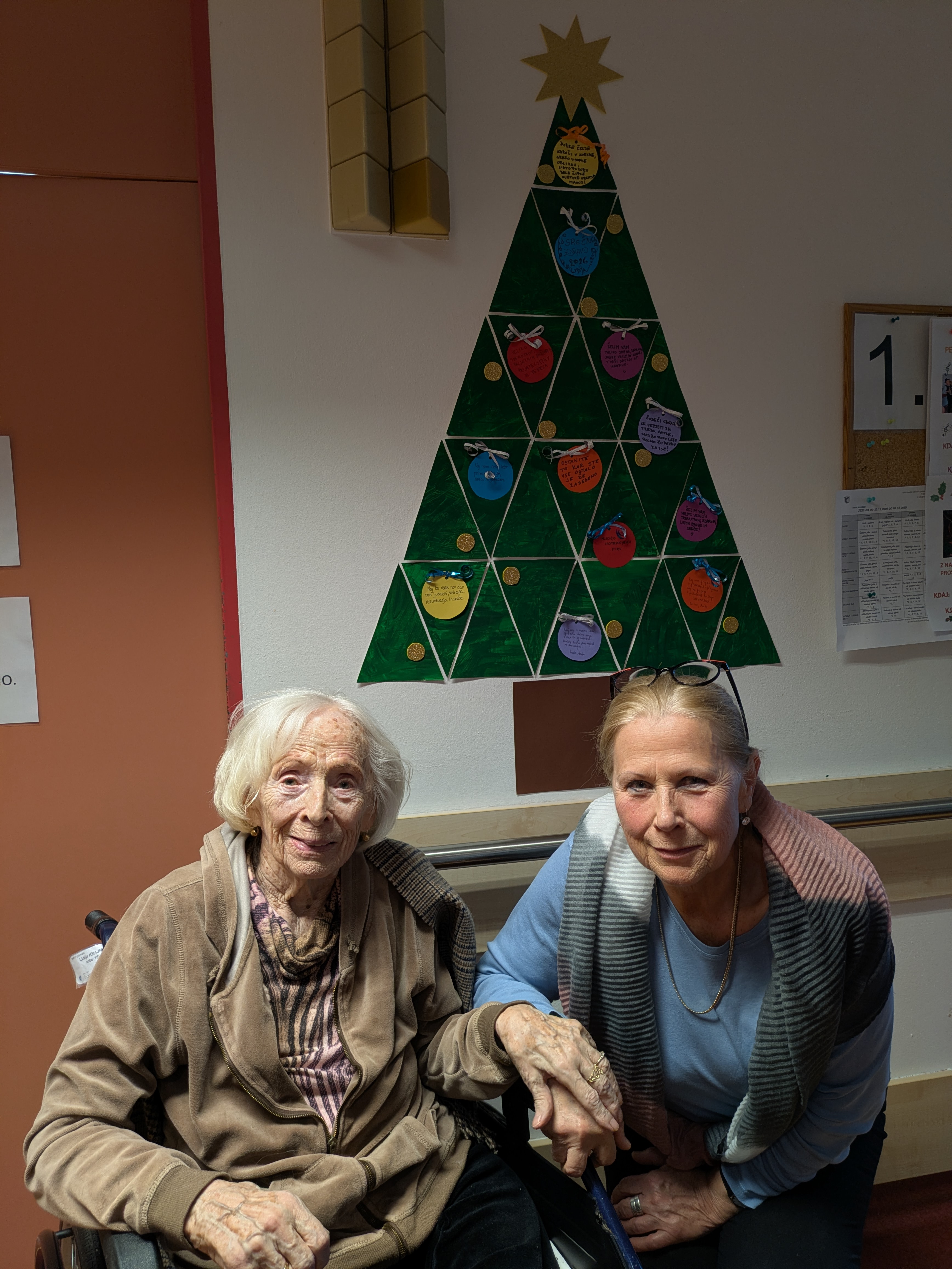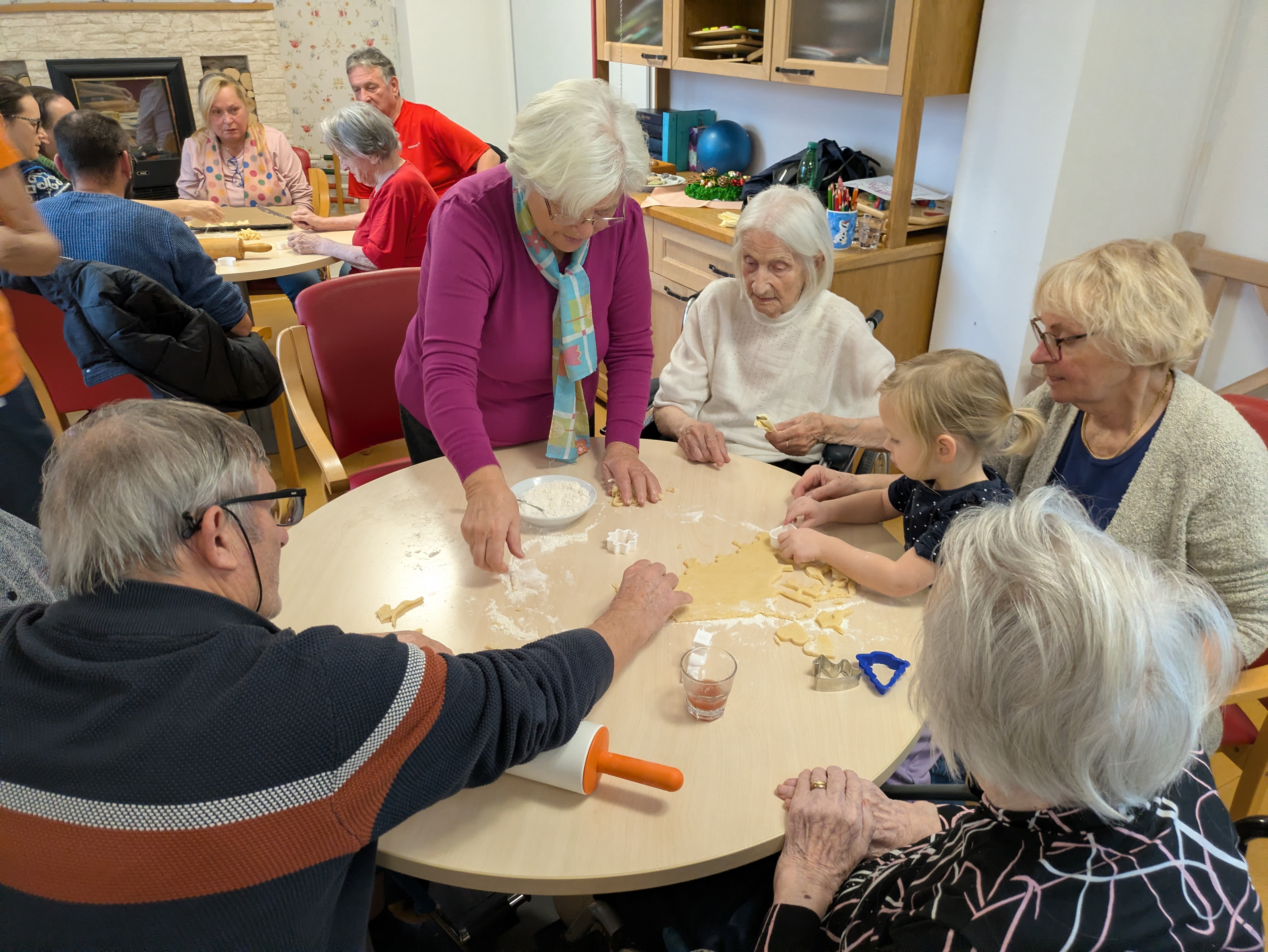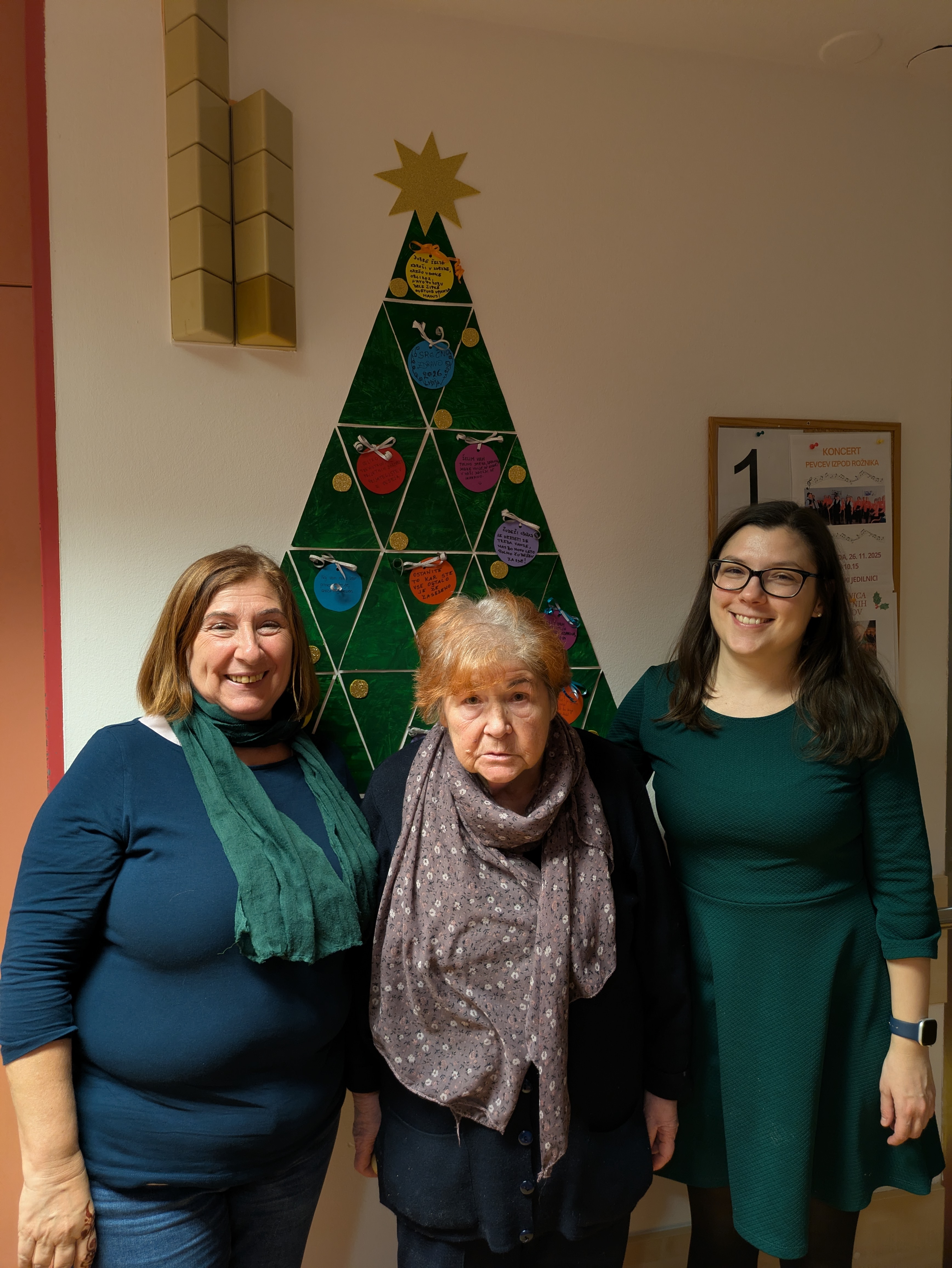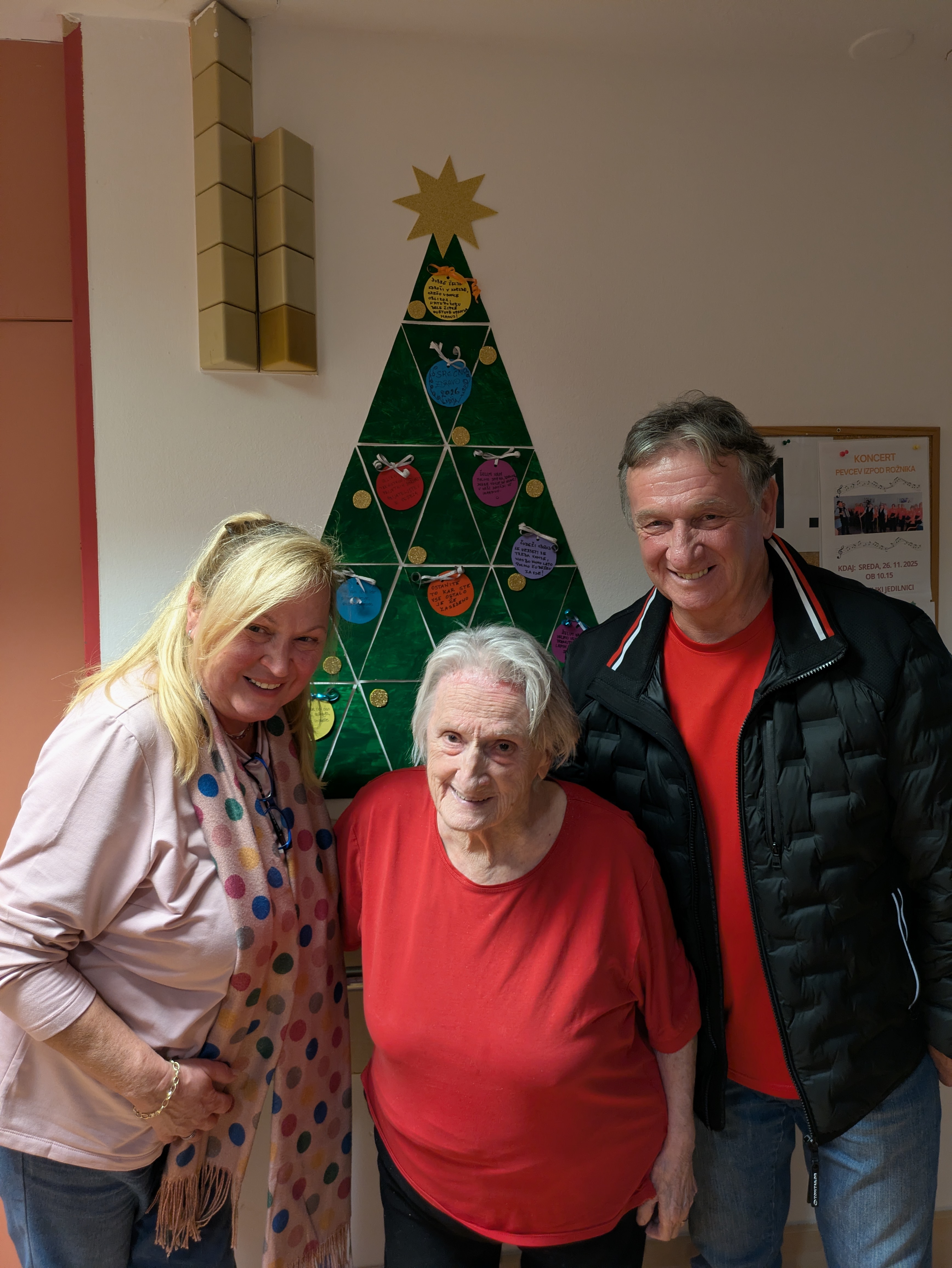 V sredo, 26. 11. 2025 je v dnevnem prostoru na enoti potekalo druženje stanovalcev z demenco in njihovih sorodnikov. Veseli smo, da so se v tako velikem številu odzvali našemu vabilu in se nam pridružili v tem predprazničnem času. Poslušali smo praznično glasbo, se smejali in klepetali. Tokrat se nam je pridružila tudi tri leta stara pravnukinja naše stanovalke in prinesla še dodatno veselje ob pogledu na iskrene otroške oči. Naše obiskovalce smo prosili, da nam pomagajo okrasiti smrečico, ki krasi steno pred vhodom v dnevni prostor. Na papirnate okraske so nam napisali želje in lepe misli, nato smo jih prilepili na smrečico, ob kateri so se ob zaključku srečanja nekateri tudi fotografirali. Ob praznični glasbi nam prija vonj sveže pečenih piškotov, zato smo se peke lotili tudi mi. Stanovalci so s sorodniki valjali testo in oblikovali piškote. Naša študentka socialnega dela Brina je ves čas skrbno pazila, da so se vsi piškoti spekli. Srečanje smo zaključili s klepetom ob soku in svežih piškotih. Vsem se zahvaljujemo za obisk in izrečene lepe želje. Veselimo se takih srečanj tudi v prihodnje.