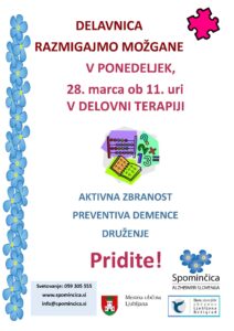 Delavnica – razgibajmo možganeObjavljeno: 21.3.2022 Delavnica – razgibajmo možganeV ponedeljek 28.3.2022 ob 11 uri v delovni terapiji.