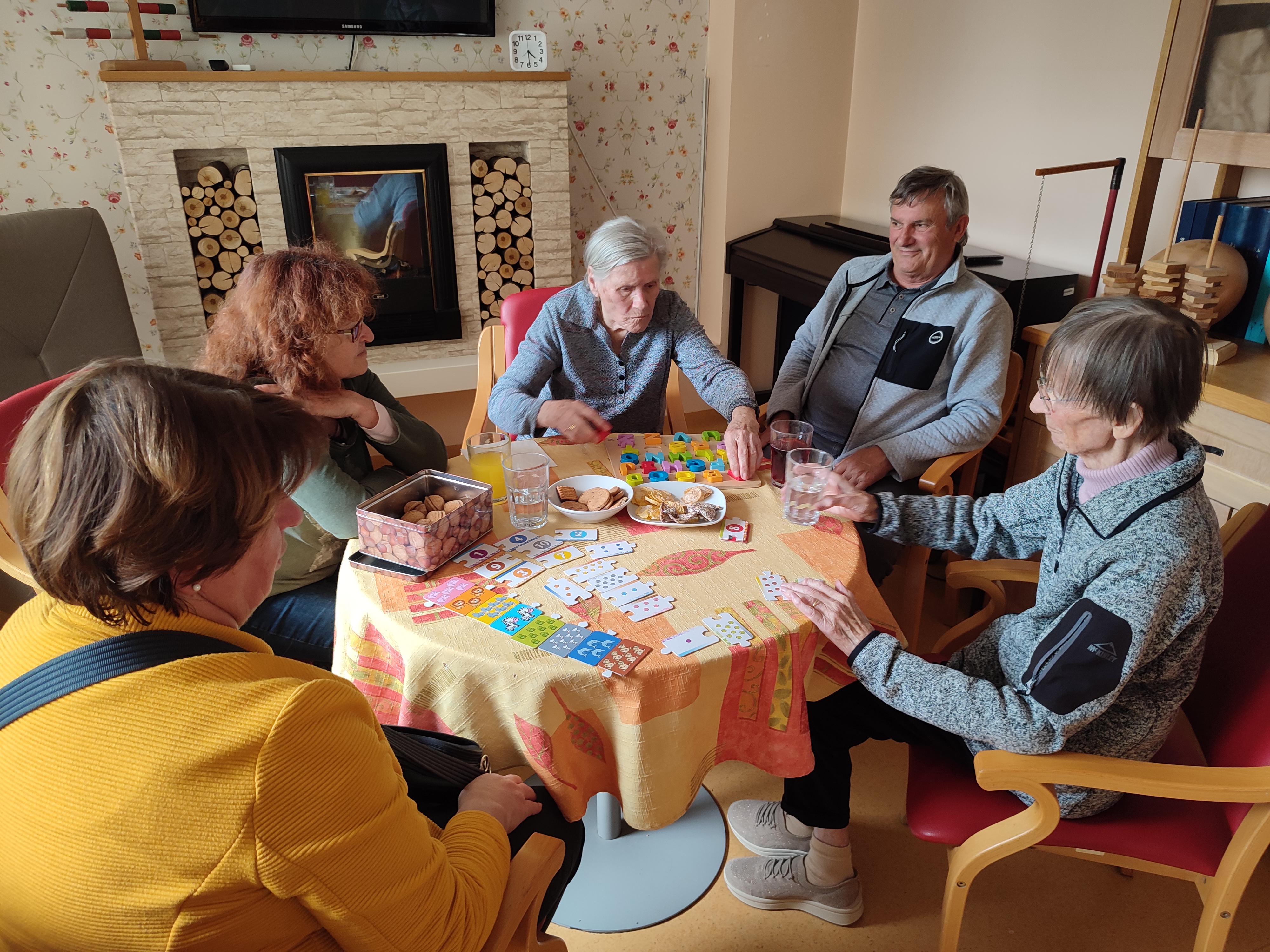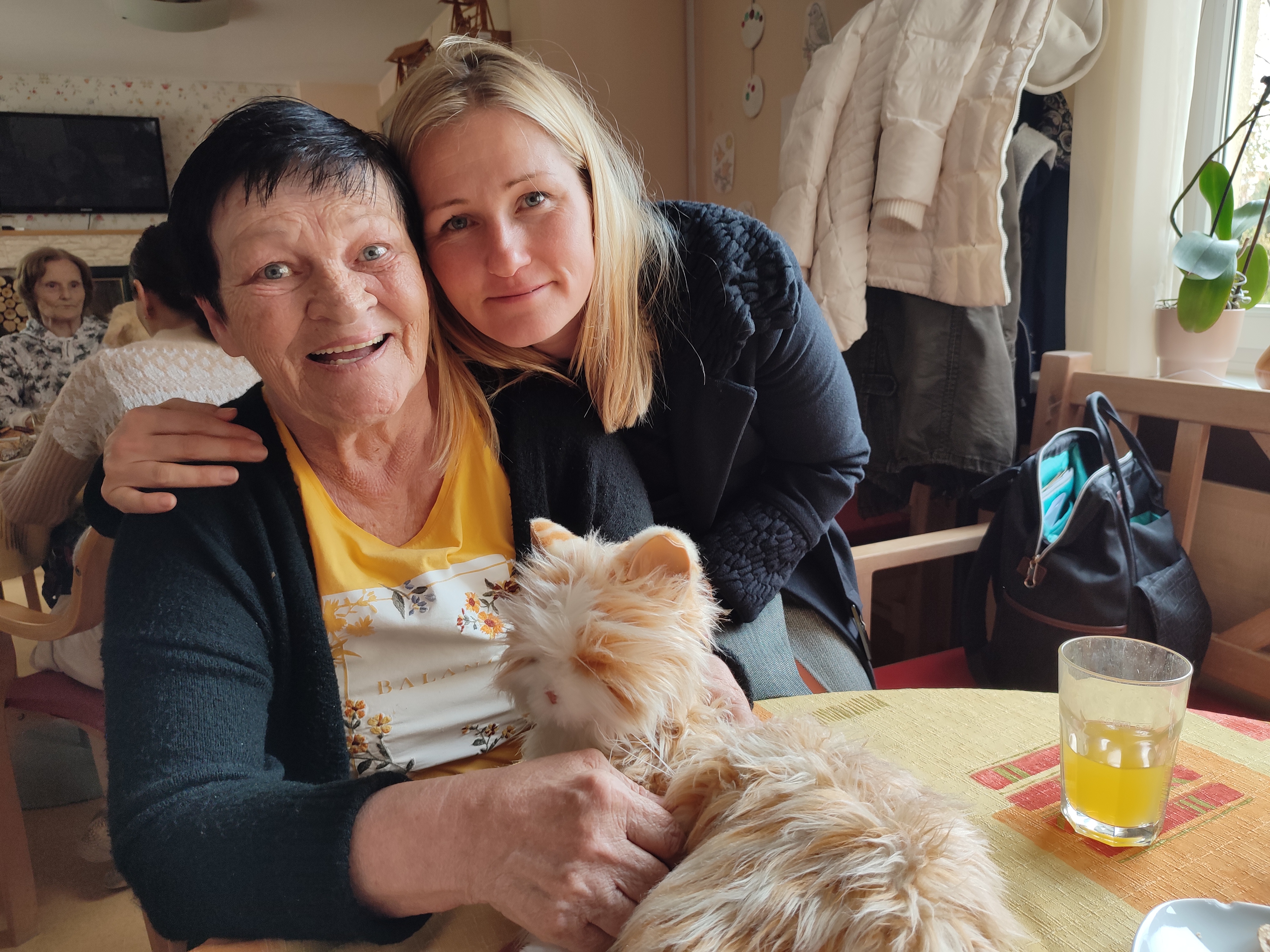V sredo, 24. 4. 2024 smo se v popoldanskem času družili skupaj s svojci v dnevnih prostorih, kjer potekata vsakodnevno skupini za stanovalce z demenco. Veseli smo bili, da je bil odziv svojcev velik. Pomembno je, da sodelujemo, ostajamo v stiku in se kdaj tudi sproščeno družimo ob pogovoru in kavi. Stanovalcem polepšamo dan, saj jih tako druženje vedno razveseli, so sproščeni in zadovoljni. Hkrati se med seboj spoznavajo svojci, izmenjujejo si izkušnje, misli in dileme. Veliko smo se pogovarjali, nato pa smo se na enoti 1. ZAH preizkusili v ugankah, pregovorih, računanju, sestavljanju besed in drugih igrah. Svojci so spoznali tudi naši terapevtski igrači, muco Lizo in kužka Maksa. Bili so navdušeni in se iz srca nasmejali, ko so videli, da se živali odzivata z glasovi, pomežikneta, muca si poliže tačko in zastriže z ušesi, kuža odpre gobček ipd. Bilo je zelo zabavno. Na enoti 3. VZH pa so izdelovali prikupne lutke.