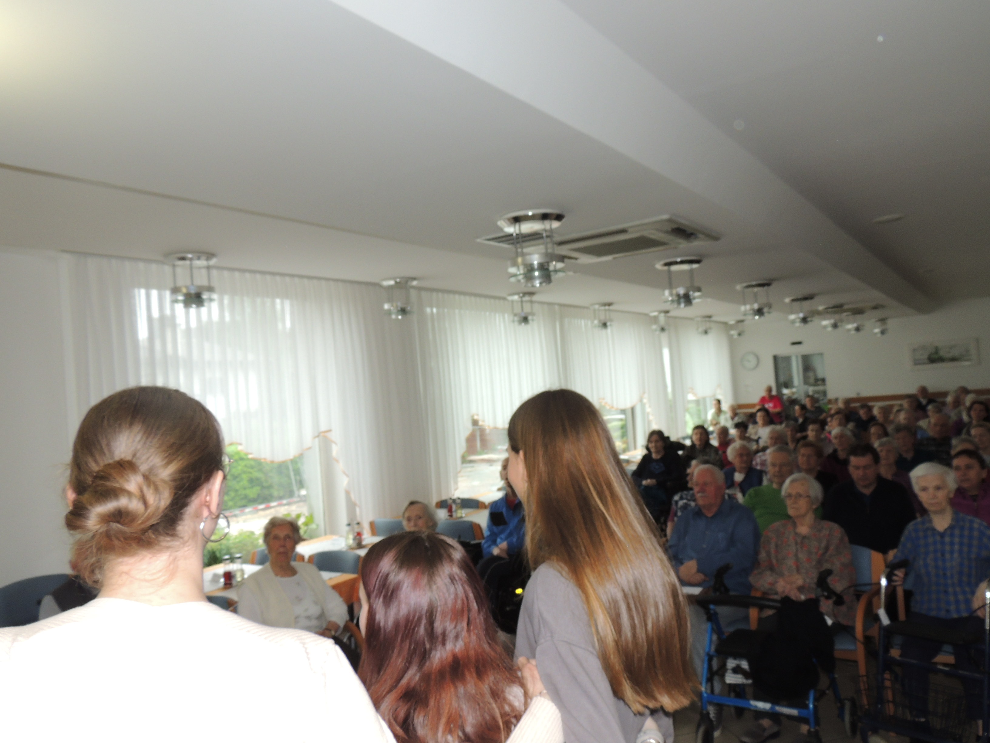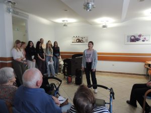 V petek so dijakinje za stanovalce pripravile prijeten krajši kulturni program. Ob spremljavi klavirja in prečne flavte so zapele Kekčevo pesem ter Sem deklica mlada vesela. Recitirale so pesmi našega največjega pesnika Franceta Prešerna: Zgubljena vera, Glosa in Od železne ceste. S prečno flavto je dijakinja zaigrala instrumentalno skladbo in dijakinja je zapela pesem Aleluja.