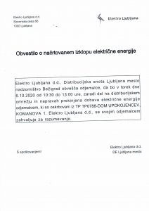 Elektro Ljubljana d.d., Distribucijska enota Ljubljana mesto nadzorništvo Bežigrad obvešča odjemalce, da bo v torek, dne 6.10.2020 od 10.30. do 13:00 ure, zaradi del na distribucijskem omrežju in napravah prekinjena dobava električne energije odjemalcem, ki so oskrbovani iz TP TP0788- Dom upokojencev, Komanova 1.