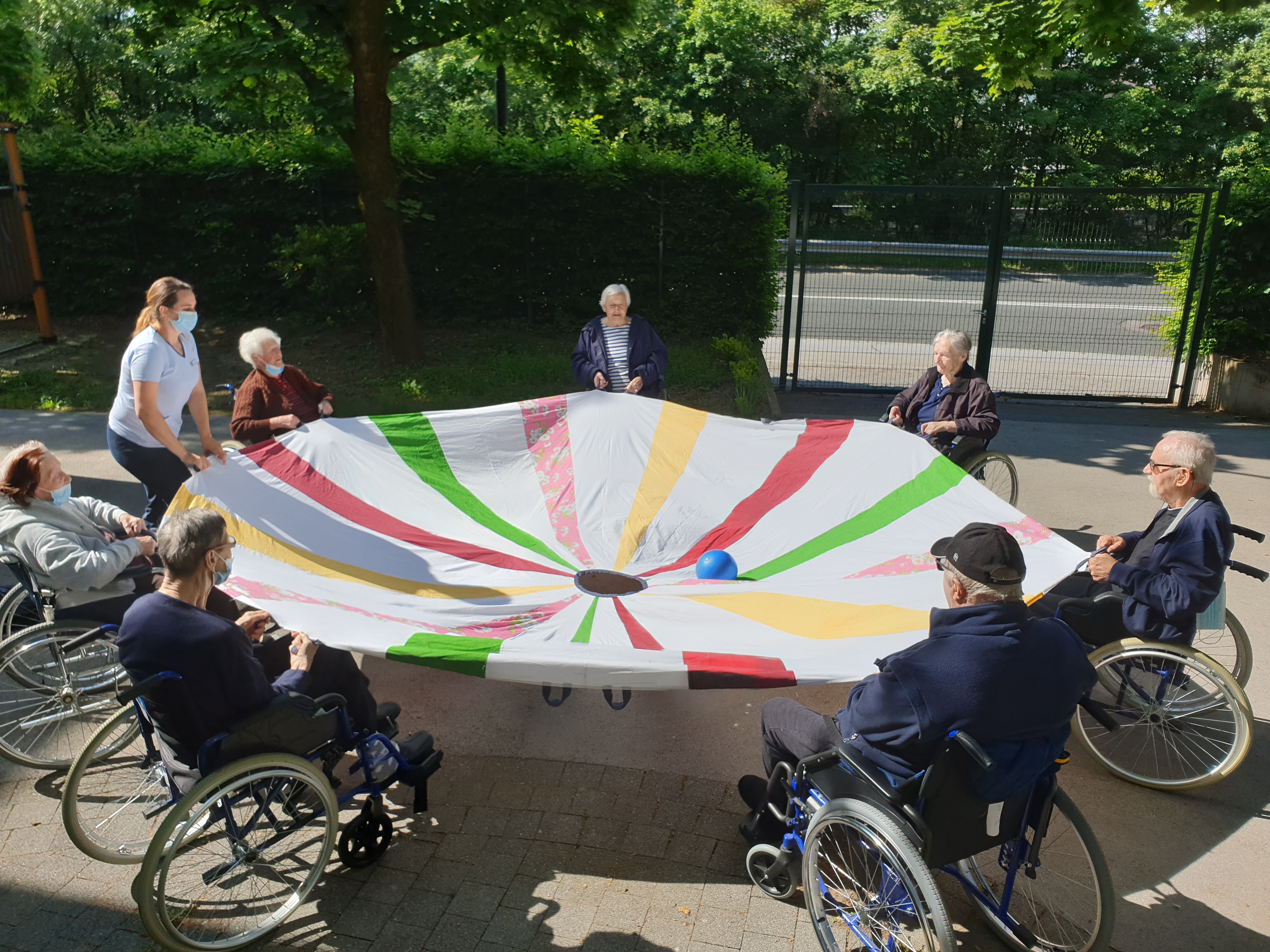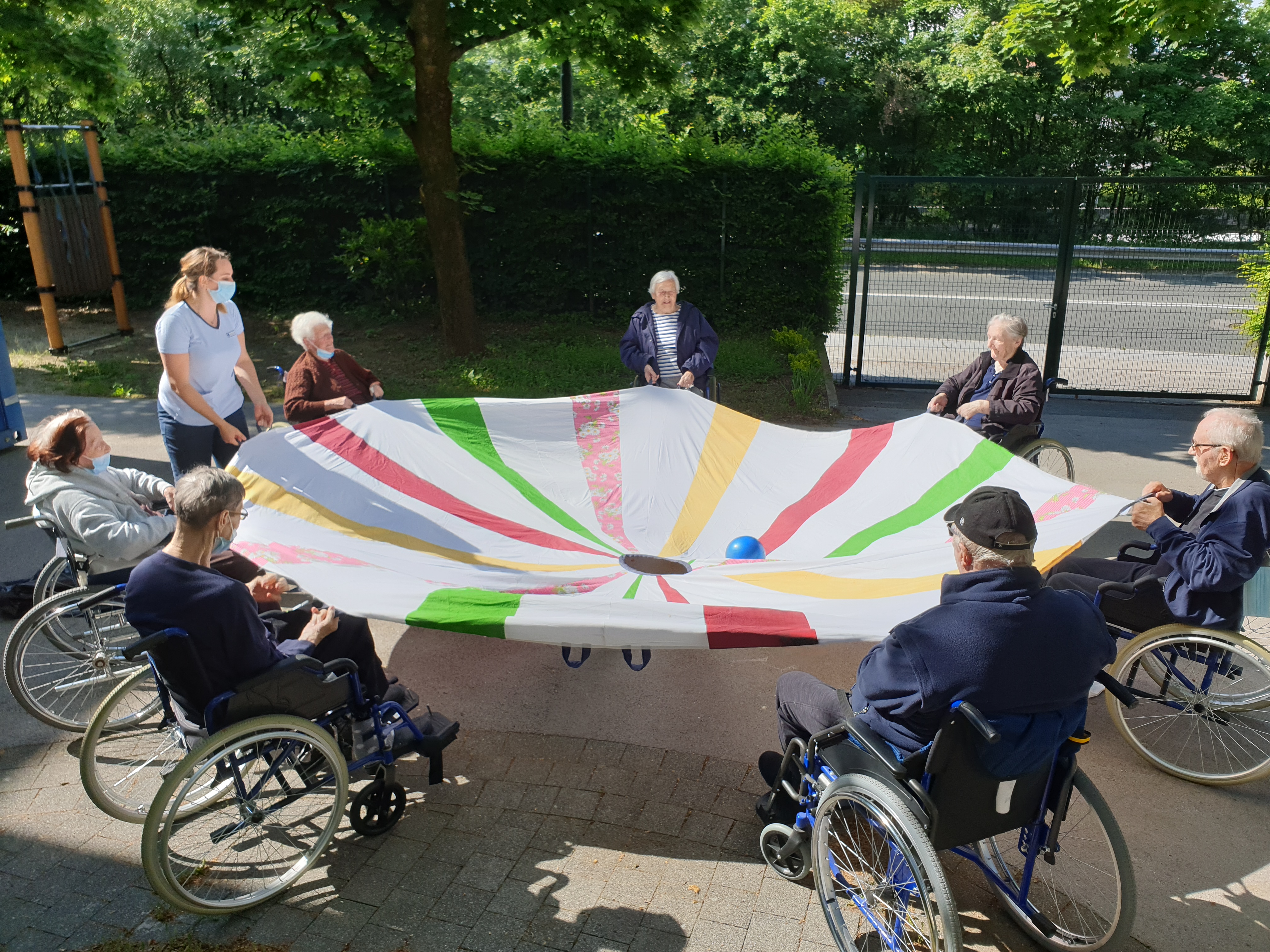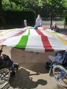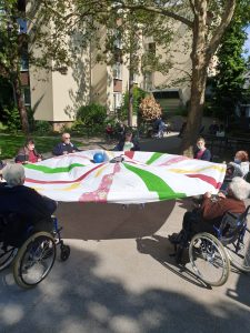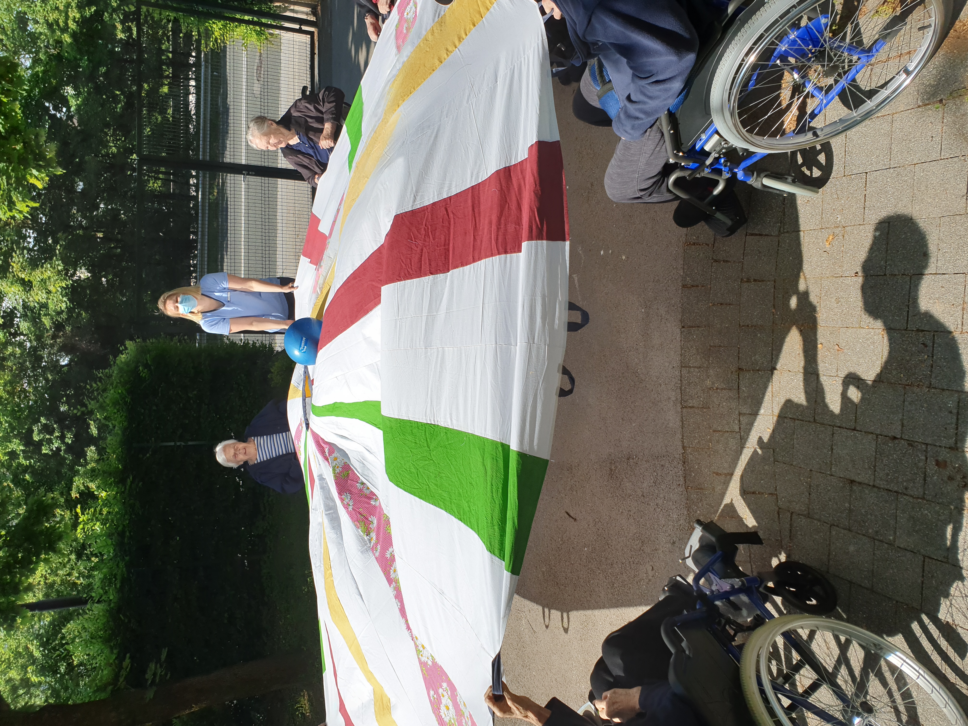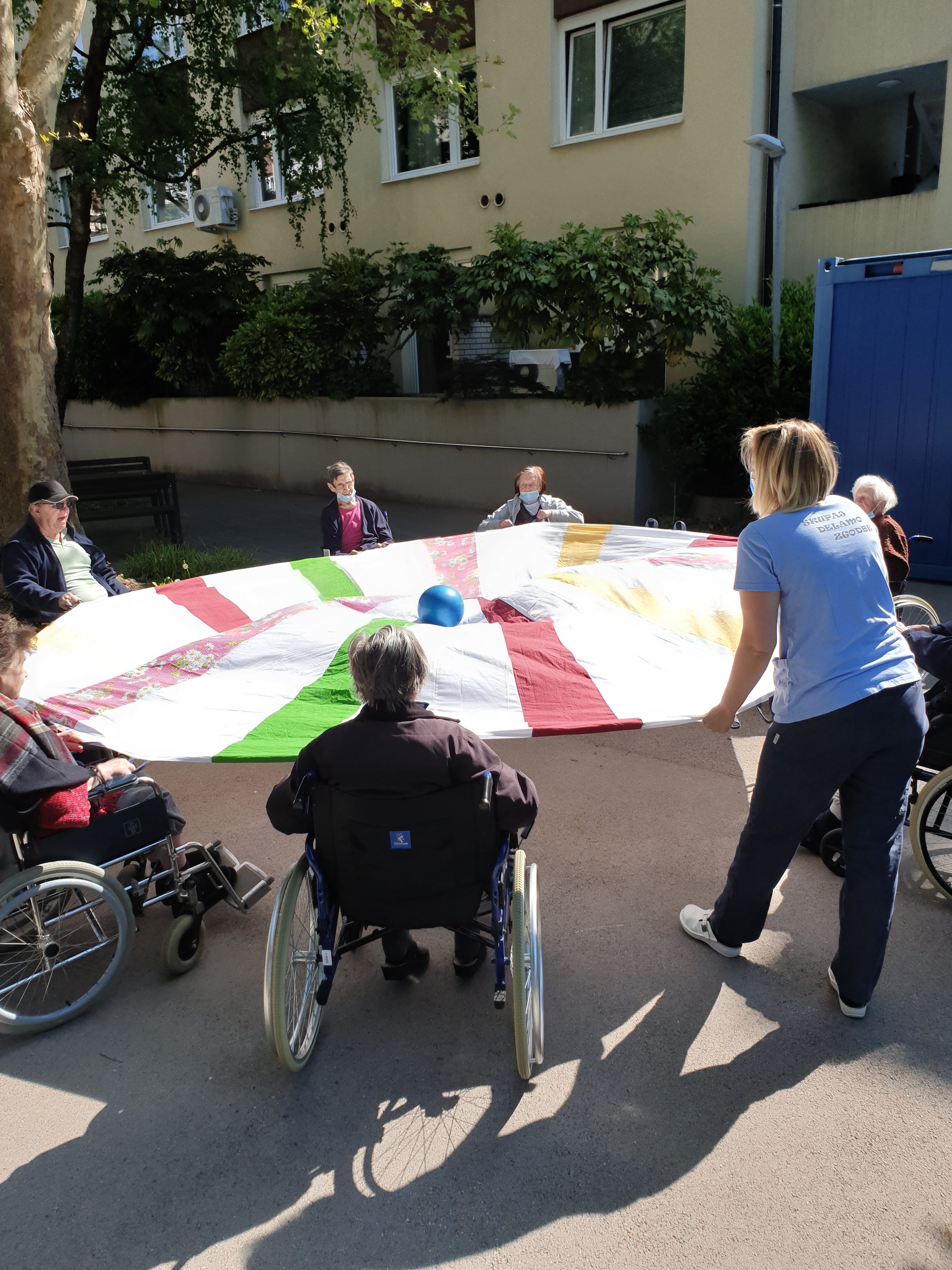 Platno v domskem parkuObjavljeno: 2.6.2021 Platno v domskem parkuTokrat so stanovalci med dopoldanskimi aktivnostmi v domskem parku razgrnili platno in telovadili z njegovo pomočjo.