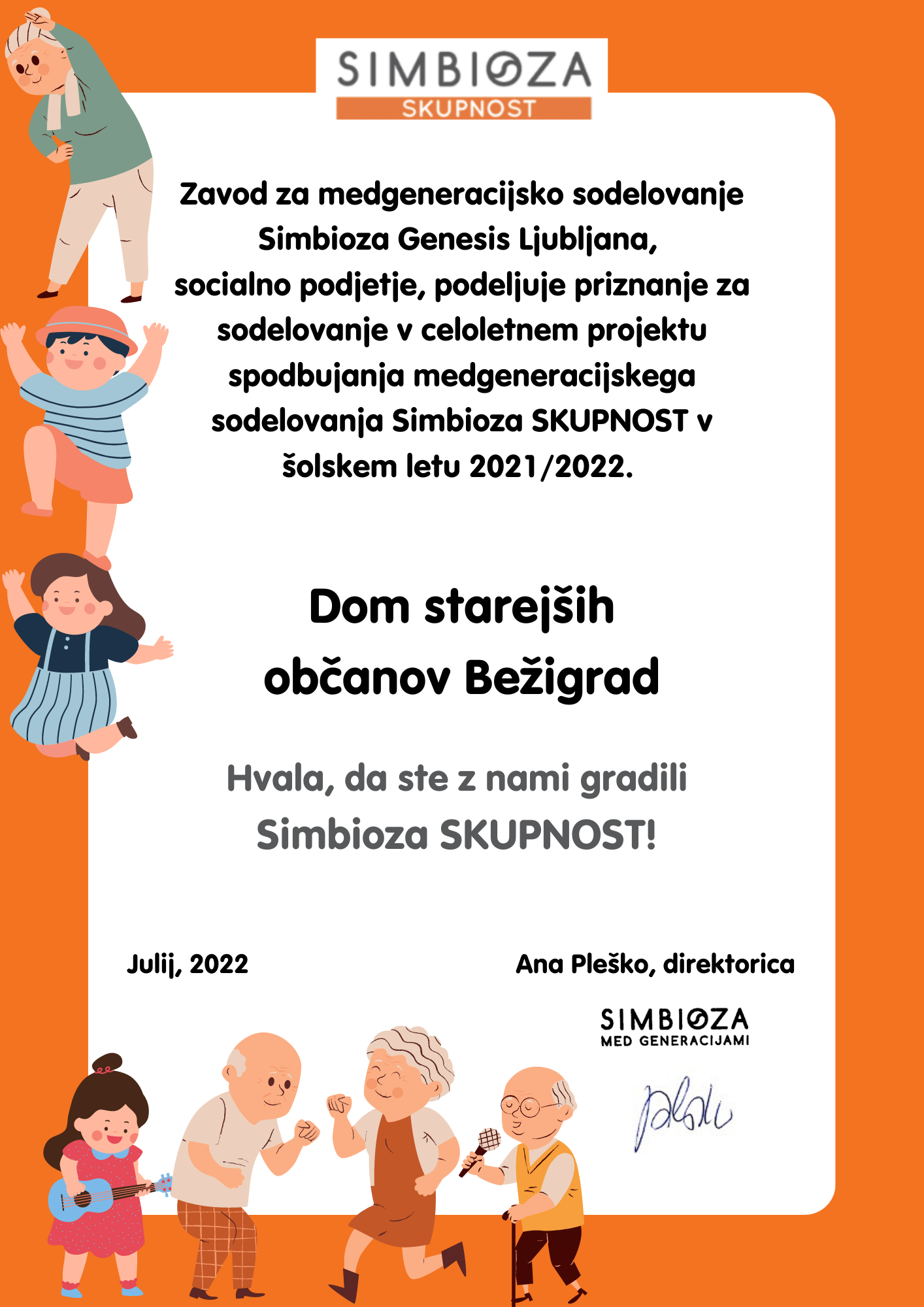 Potrdilo DSO Bežigrad za sodelovanje v Simbiozi skupnosti