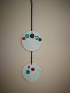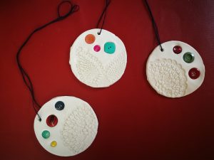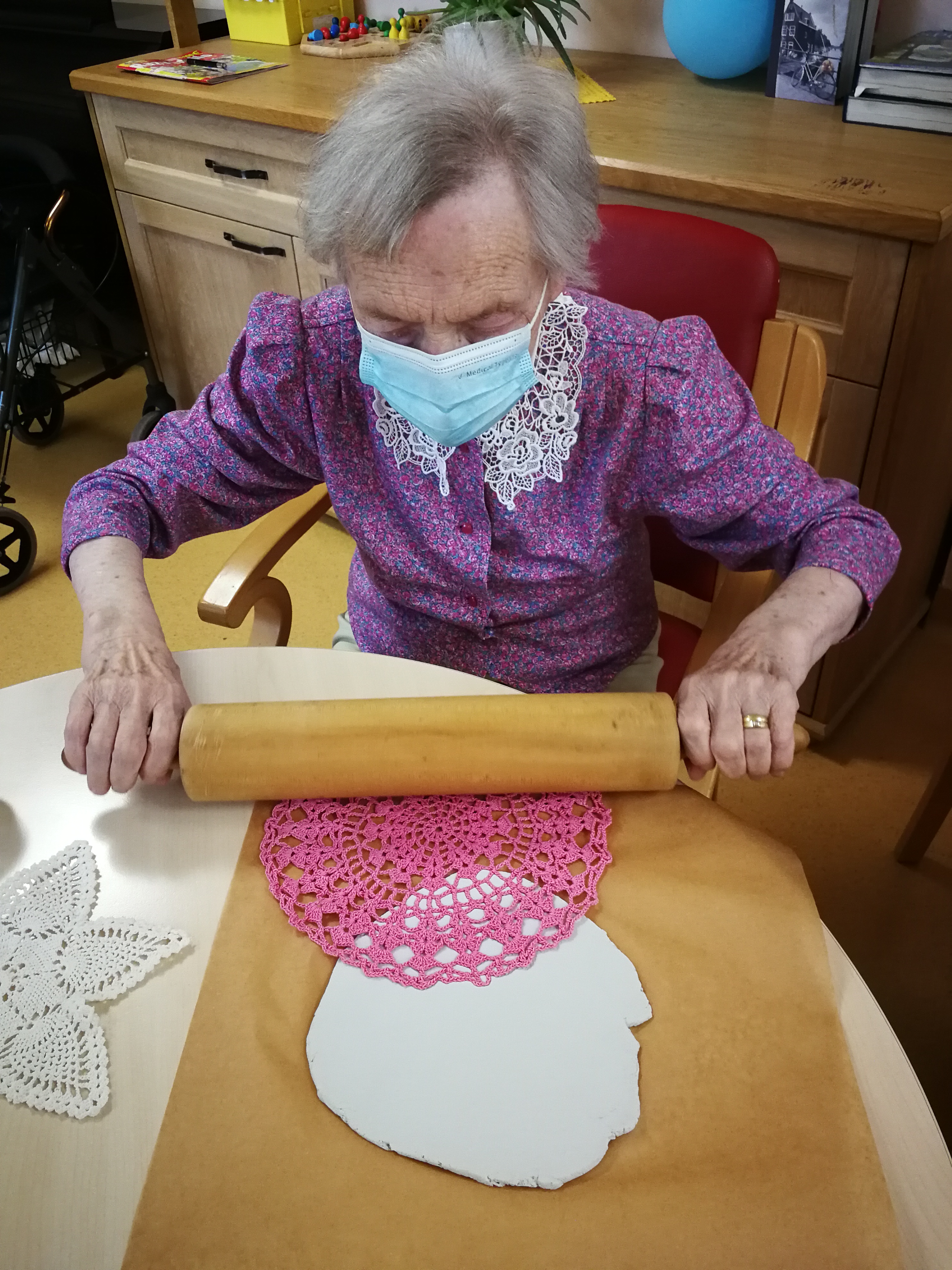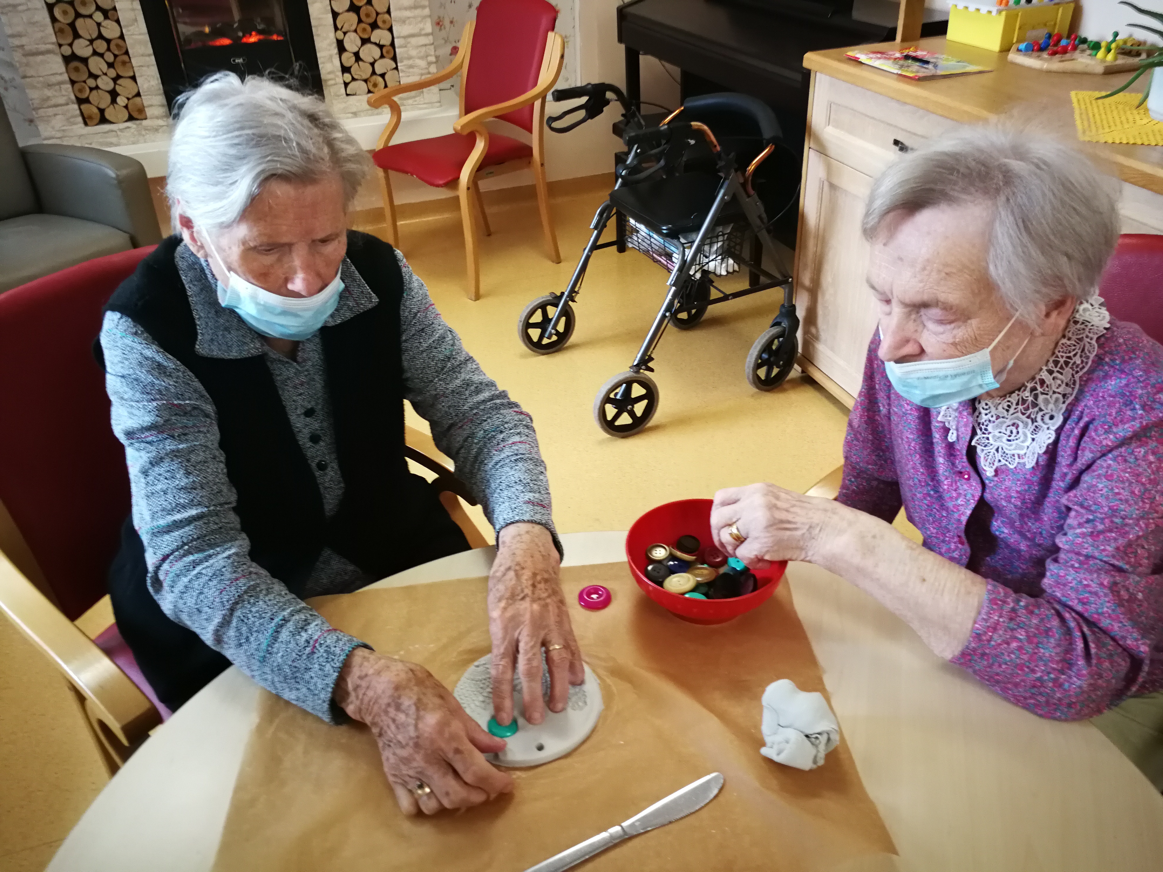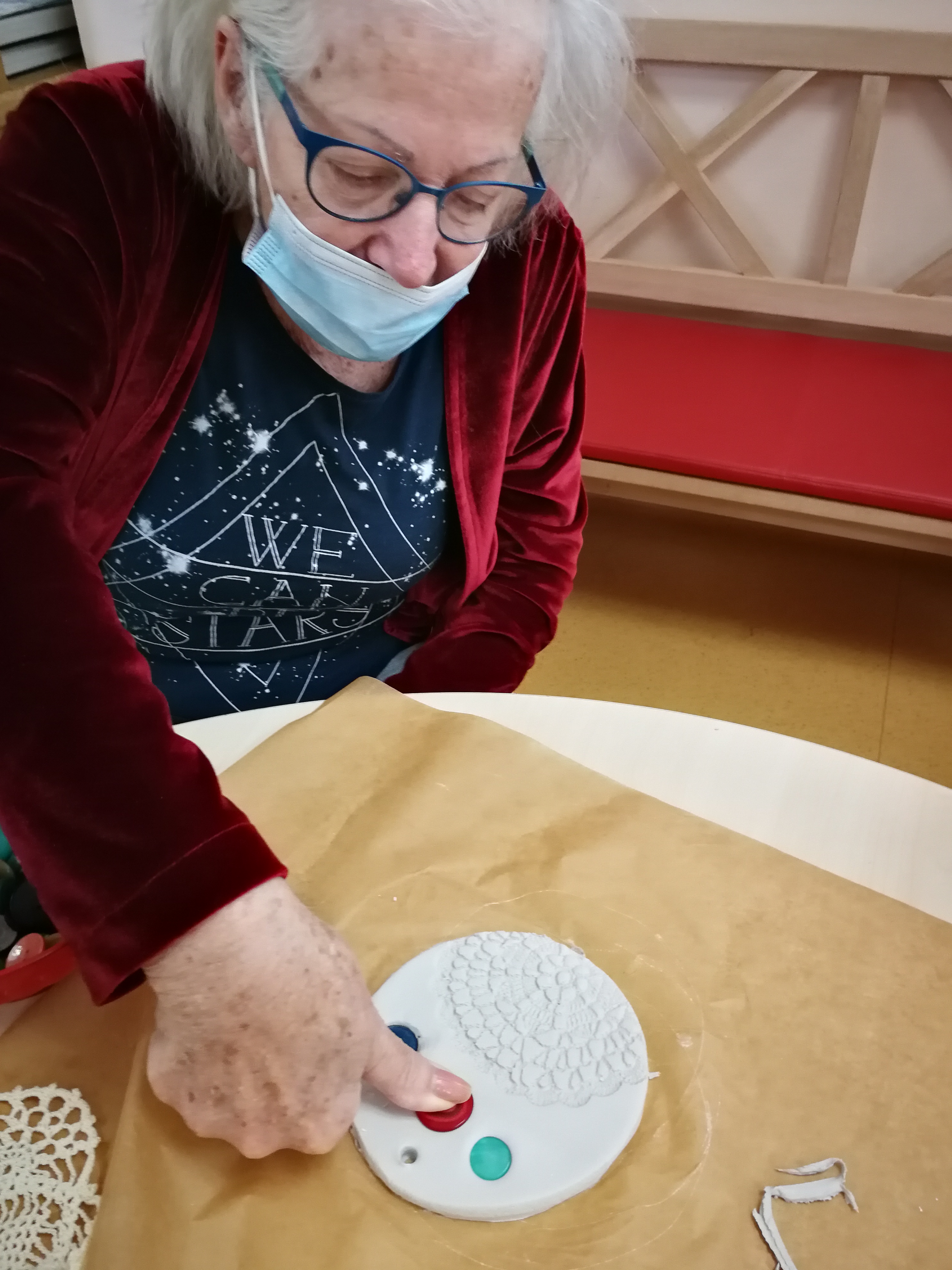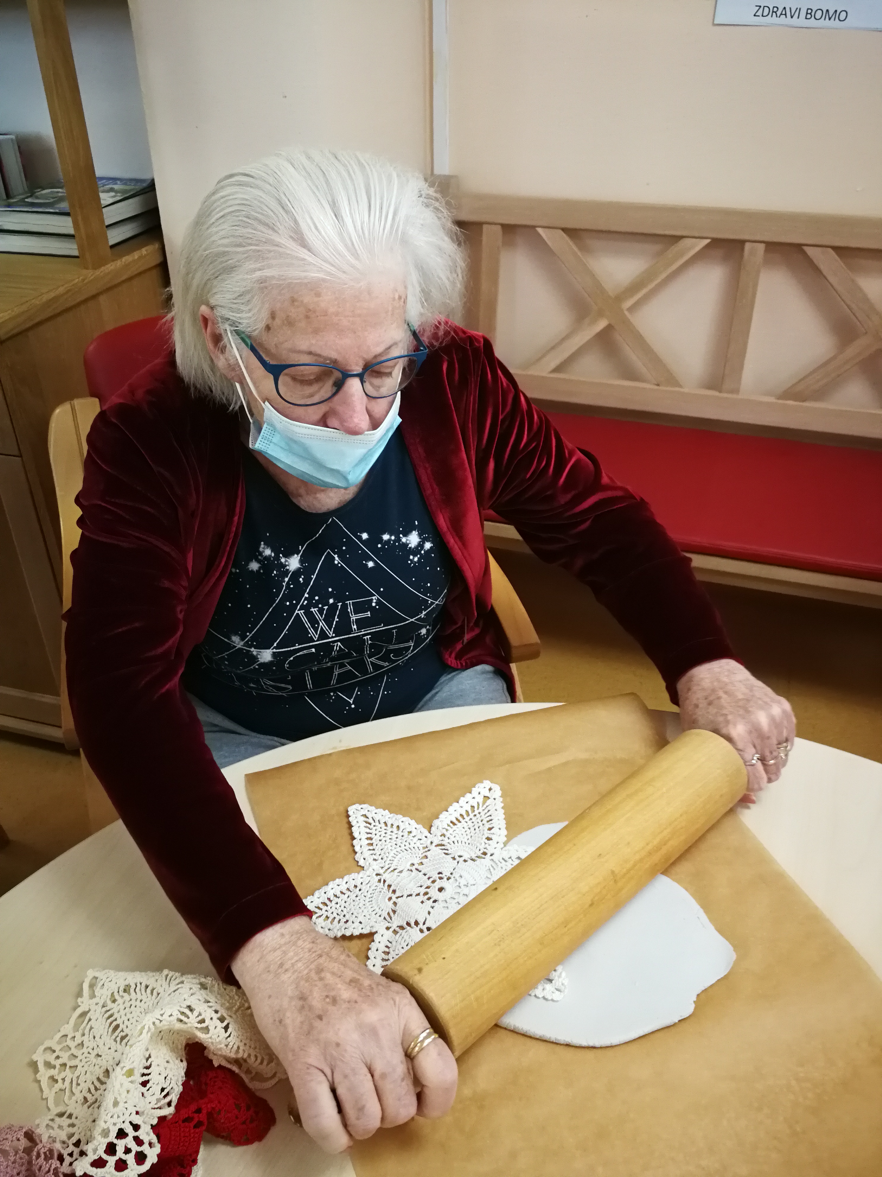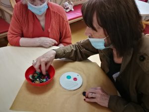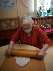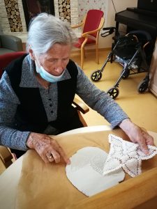 Na skupini za demenco so tokrat ustvarjali s fimo maso, kvačkanimi prtički in gumbi.