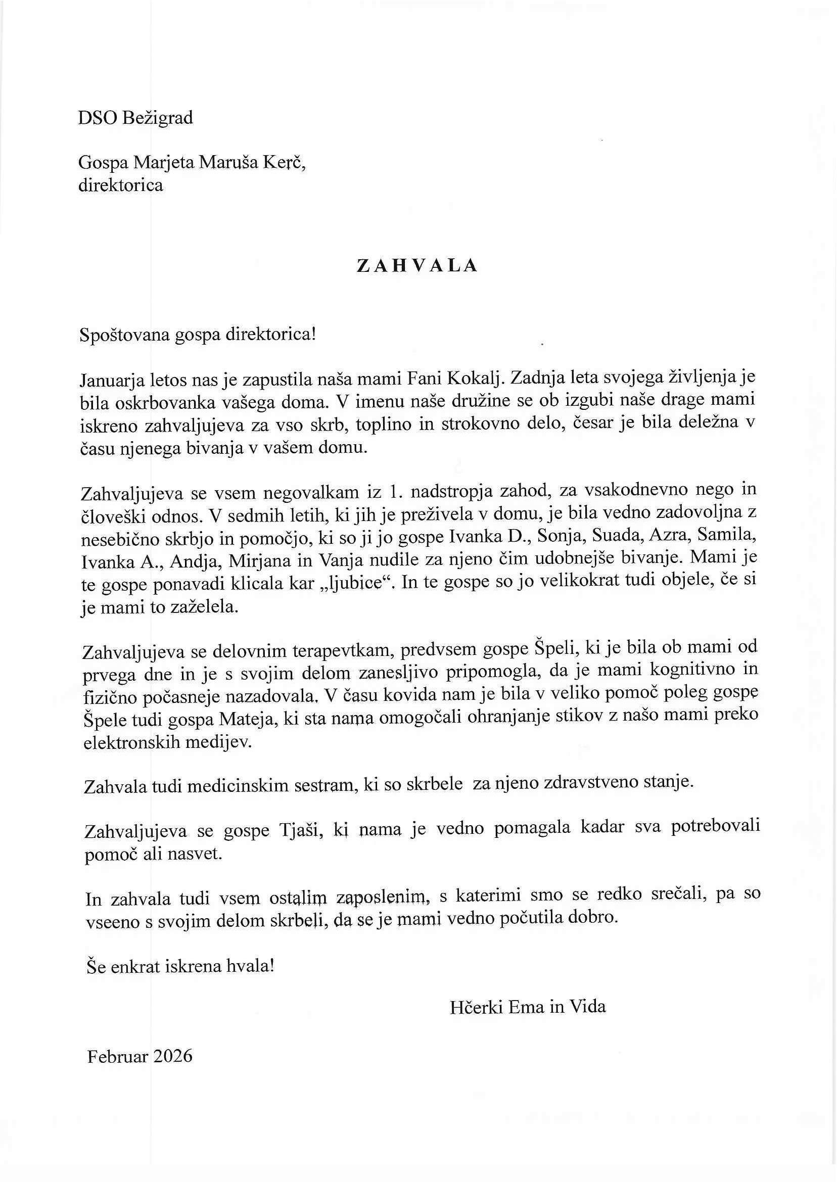V DSO Lj-Bežigrad je bila mama ob pozornem in skrbnem osebju zadovoljna, saj je v domu bivala dvanajst let in sedem mesecev. Prisrčno se zahvaljujemo vsem in vsakemu posebej v DSO Lj-Bežigrad za vse dobro, pa saj je bil to mamin dom in mame imajo vedno prav.
